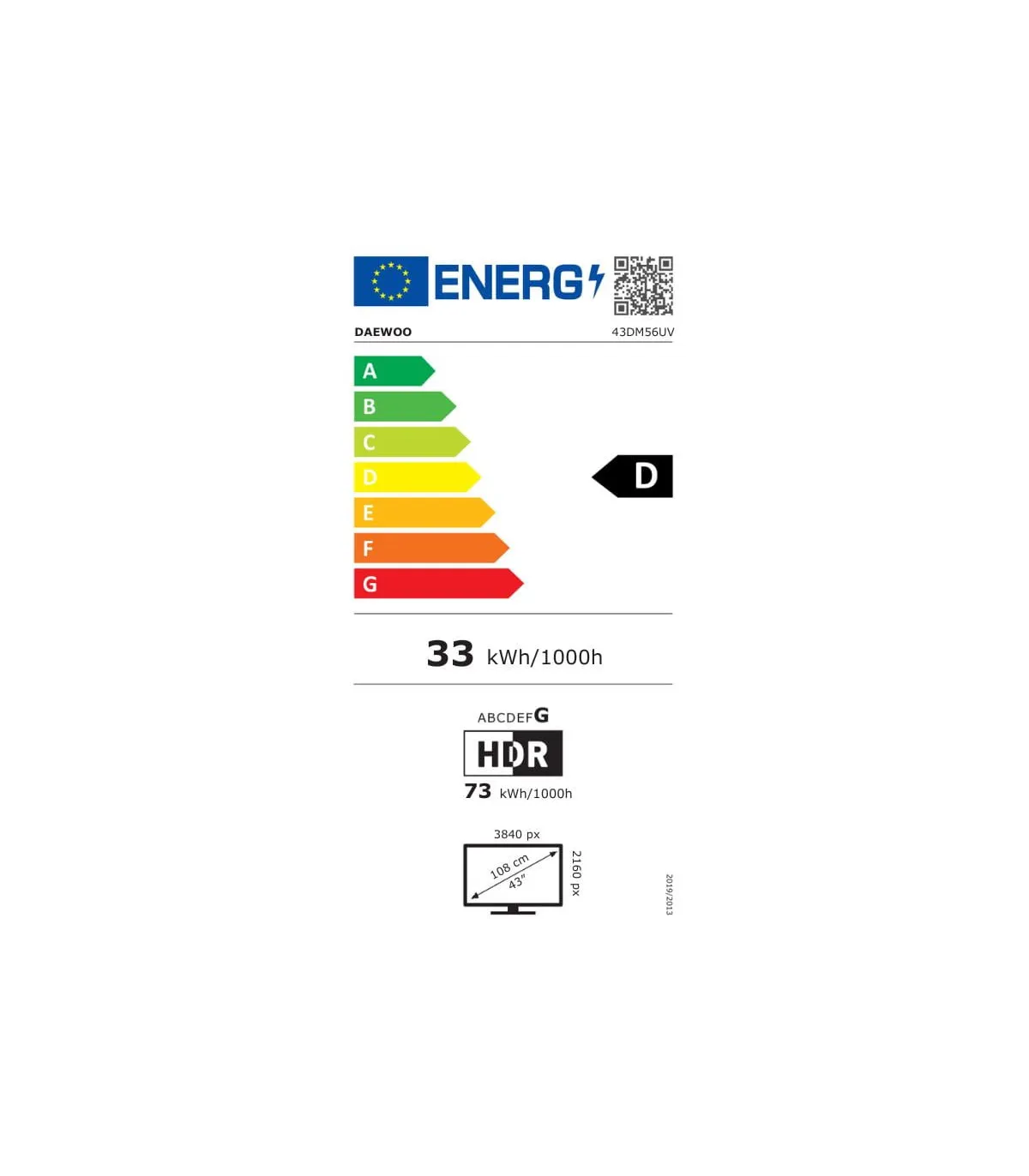 Découvrez le téléviseur Daewoo 43DM56QV, un modèle performant de 43″ (~109 cm) doté d’une dalle QLED 4K Ultra HD (3840 × 2160 px). Grâce à son système d’exploitation VIDAA Smart TV, vous accédez à vos plateformes de streaming préférées via Wi-Fi et Ethernet. Côté image : technologie QLED pour des couleurs intenses et une excellente lisibilité. Le son délivre une puissance estimée de 16 W RMS avec prise en charge Dolby Audio. En connectique : 2 ports HDMI, 1 port USB, sortie optique S/PDIF, port RJ-45 LAN et Wi-Fi intégré. Une solution compacte et polyvalente pour votre salon connecté.