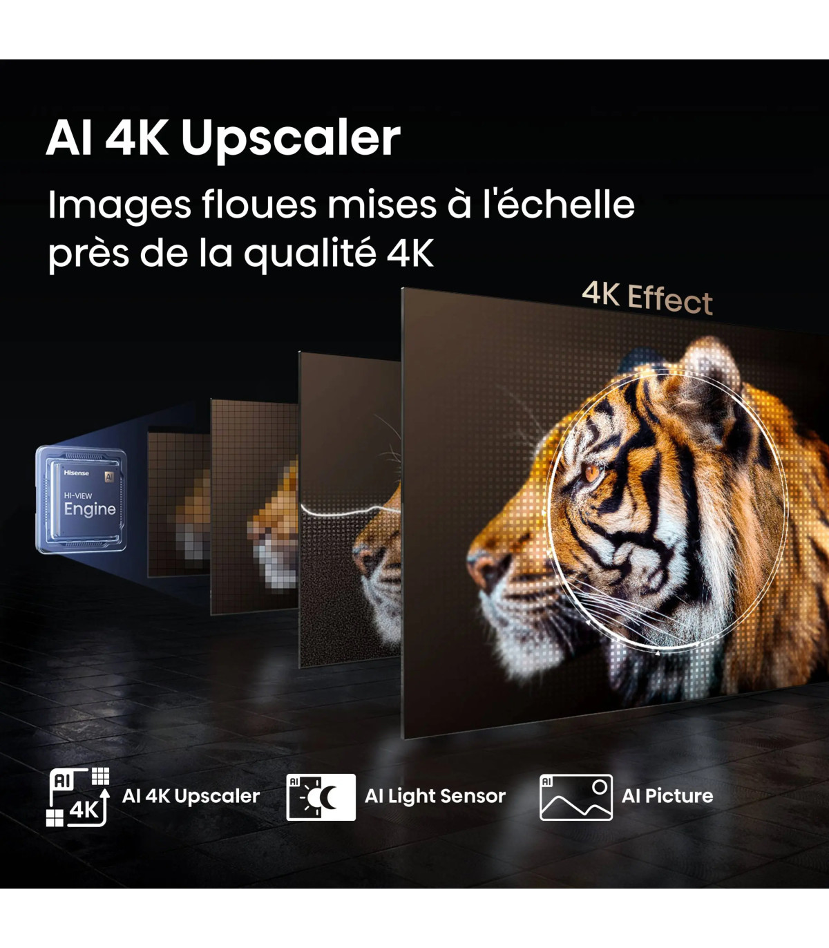 Au cœur du Hisense 100E7Q PRO se trouve un processeur quad-core qui assure une navigation fluide et rapide à travers les menus et applications. Ce processeur robuste garantit également que le téléviseur peut gérer sans effort la haute résolution 4K UHD, offrant ainsi des images toujours nettes et fluides.