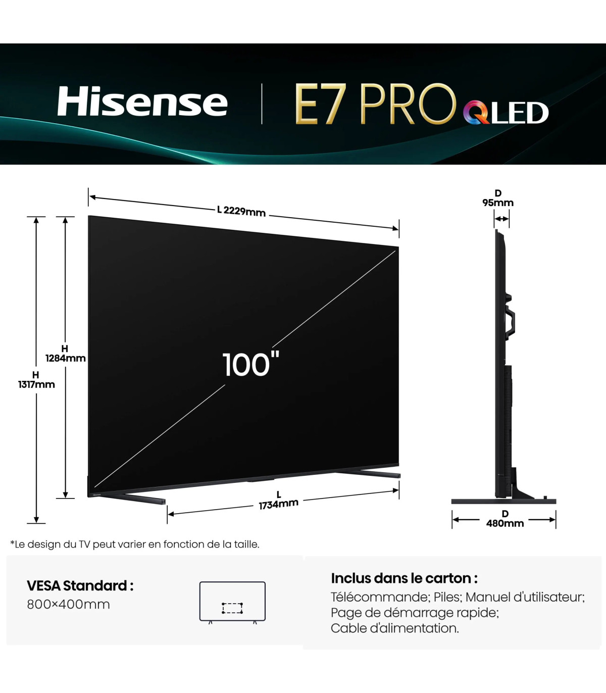 En conclusion, le Hisense 100E7Q PRO combine design élégant, qualité visuelle exceptionnelle et performances audio supérieures dans un seul package impressionnant. Que vous soyez cinéphile exigeant ou amateur occasionnel du grand écran , ce téléviseur saura répondre à vos attentes et transformer votre expérience de visionnage en un véritable plaisir.