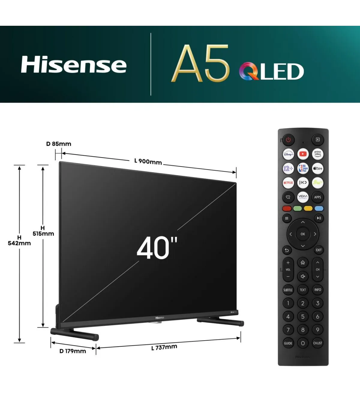 Plongez au cœur de vos films et séries avec le Hisense 40A5Q 40" Full QLED au design fin et élégant, idéal pour le salon ou la chambre. Sa dalle 40" (101 cm) offre une image QLED éclatante avec une résolution Full HD 1920 x 1080, couleurs riches et contraste précis. Propulsé par un processeur quad-core et la plateforme VIDAA U, accédez instantanément à vos applications de streaming. Profitez d’un son immersif avec Dolby Audio et un traitement DTS clair et puissant. Connectivité complète : 3x HDMI, 2x USB, sortie audio optique, entrée composite, prise casque, CI+, pour vos consoles, barres de son et lecteurs. Restez connecté avec le Wi‑Fi intégré et le Bluetooth pour casques et enceintes. Contrôle vocal et navigation fluide pour une expérience home cinéma accessible et performante. Le Hisense 40A5Q combine QLED, Smart TV VIDAA, connectique polyvalente, Wi‑Fi et Bluetooth pour sublimer votre divertissement au quotidien.