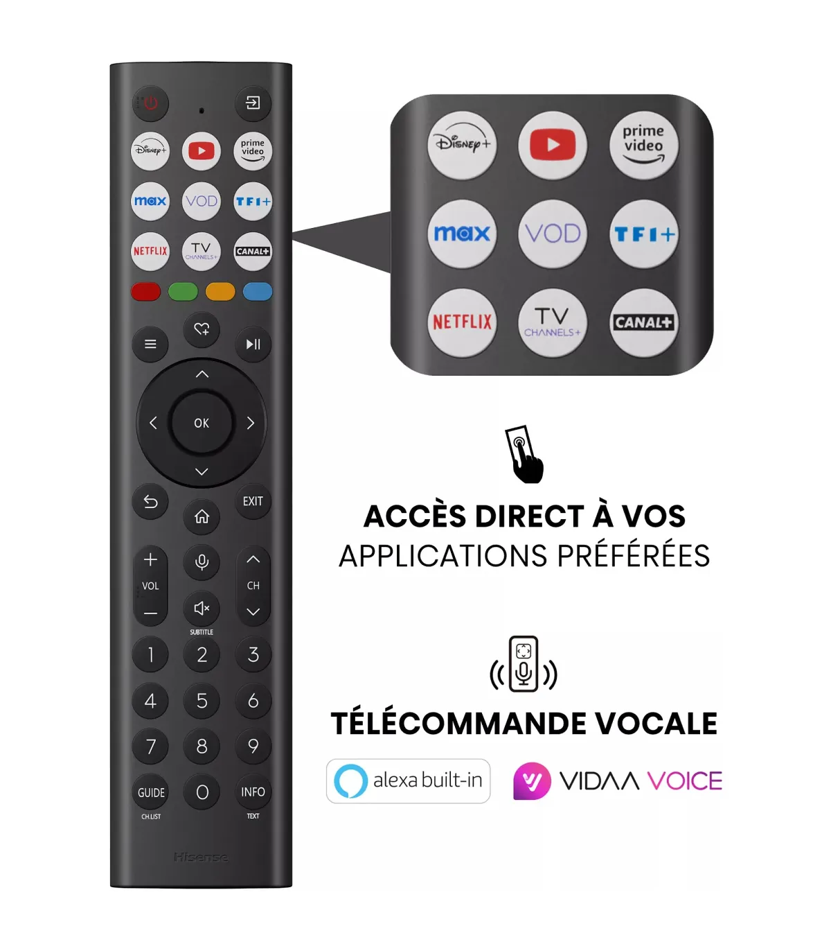 Propulsé par VIDAA, l’interface Smart TV est rapide, intuitive et personnalisable. L’accès aux principales plateformes de streaming est fluide, la recherche vocale est intégrée, et les réglages d’image avancés restent à portée. La navigation suit une logique claire, avec des applications réactives et des mises à jour régulières.