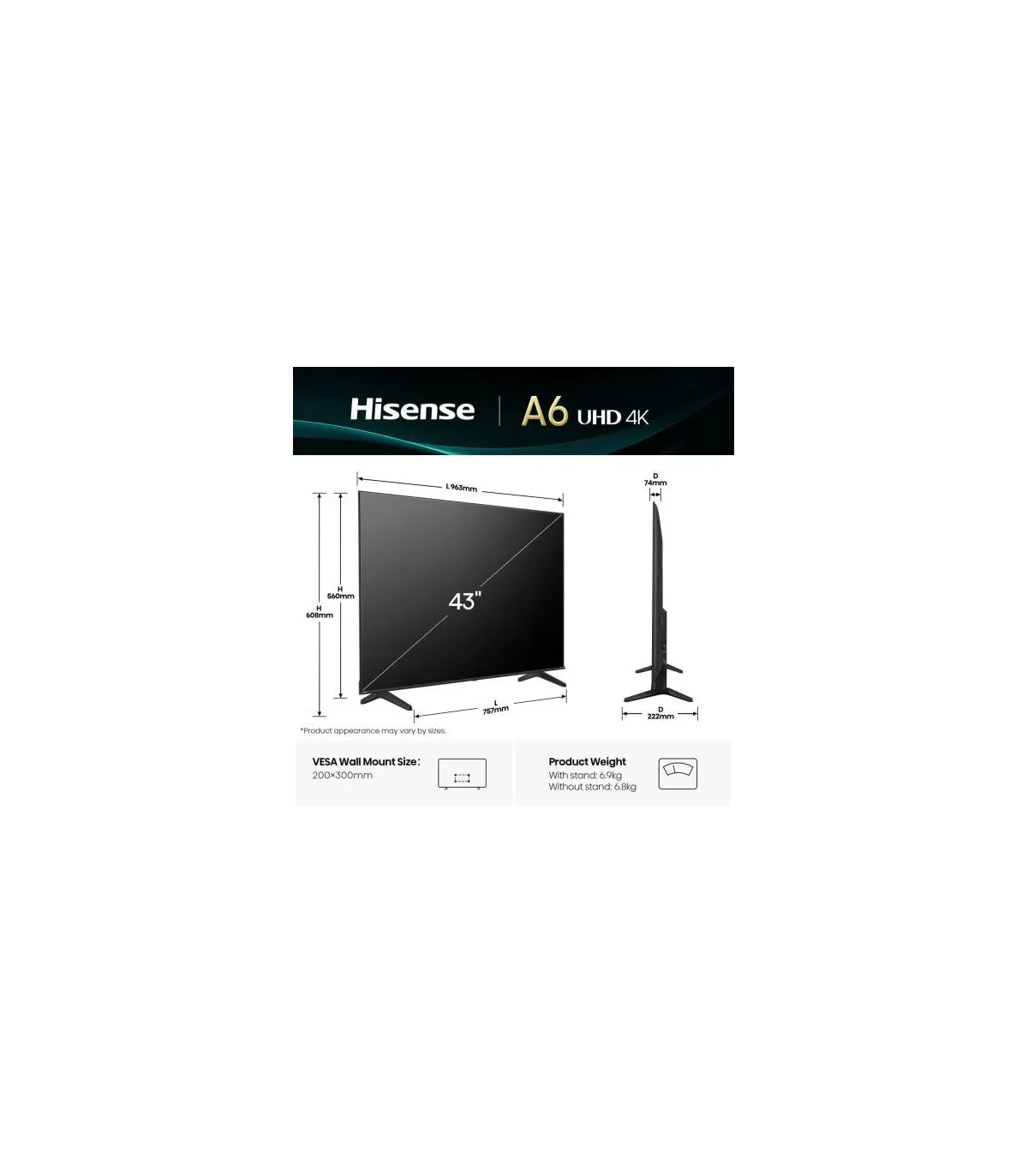 Plongez au cœur de l’action avec le Hisense 43A6Q, un téléviseur 43" (109 cm) au design fin et élégant qui sublime votre salon. Sa dalle 4K UHD (3840 x 2160) offre une image ultra-détaillée avec des couleurs riches et des contrastes profonds, idéale pour films et séries. Propulsé par un processeur puissant optimisant netteté et fluidité, il assure une expérience immersive. Le son clair et équilibré renforce chaque scène pour un véritable home cinéma. Profitez d’une navigation intuitive grâce au système d’exploitation VIDAA U et à la plateforme Smart TV VIDAA: accès rapide aux apps de streaming, contrôle simplifié. Côté connectique, bénéficiez de HDMI, USB, sortie audio, entrée antenne, port Ethernet, pour tous vos appareils. La connectivité Wi‑Fi et Bluetooth garantit un appairage facile avec barres de son, casques et smartphones. Optez pour le Hisense 43A6Q: performance, style et fonctionnalités Smart réunis pour un divertissement sans compromis.