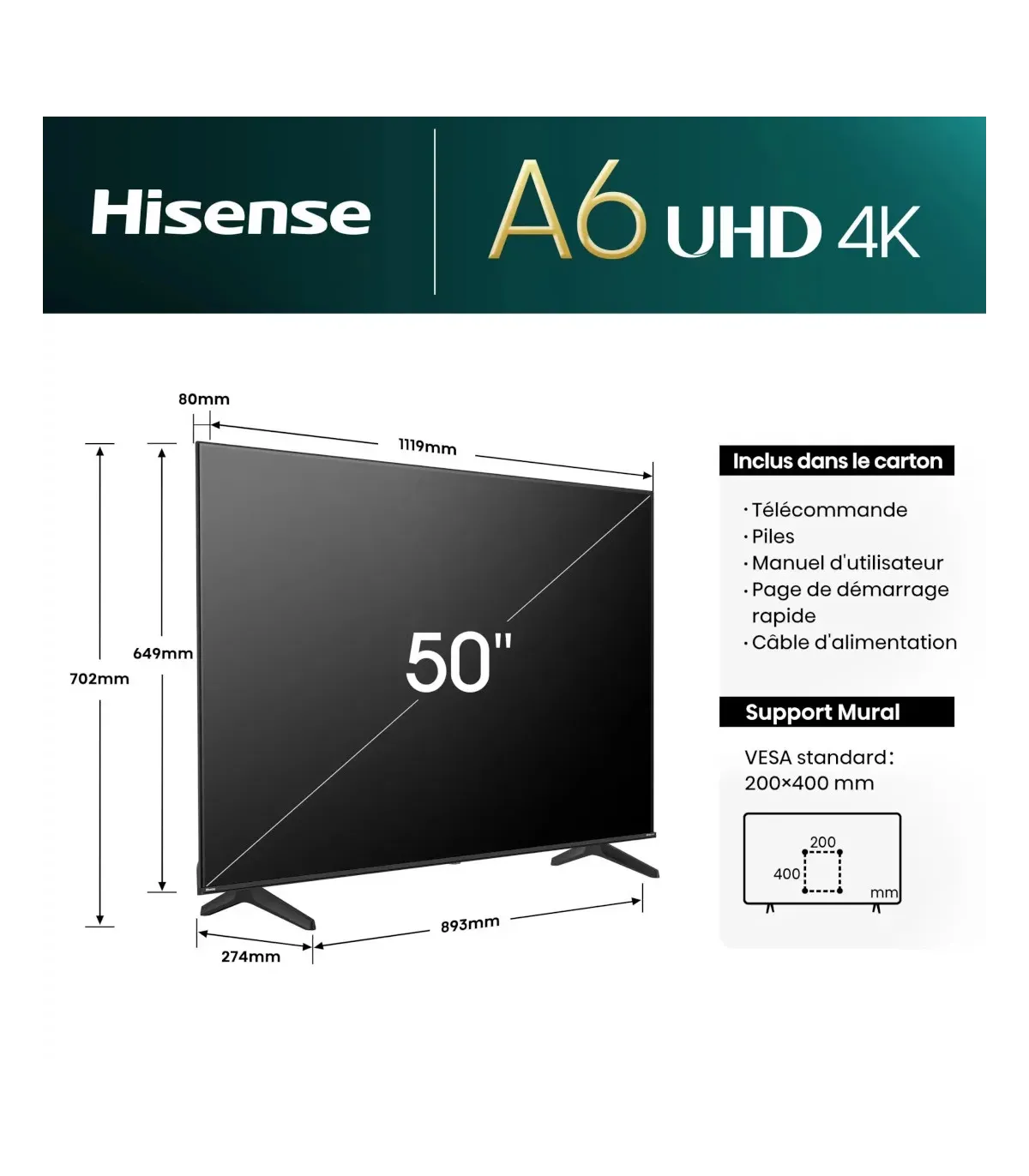 Hisense 50A6N : TV 4K UHD 50 pouces – Smart TV HDR | Achetez au Meilleur Prix