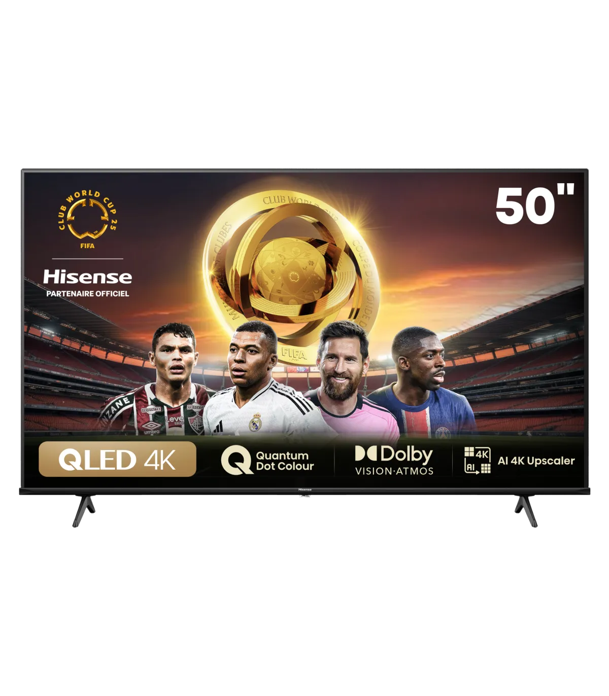 Le téléviseur Hisense 50E77NQ affiche une diagonale de 50 pouces (≈ 127 cm), un format bien équilibré qui combine présence visuelle et praticité, idéal pour un salon, une chambre ou un espace multimédia. Son châssis noir mat est sobre et moderne, avec des lignes épurées qui mettent en valeur l’écran sans le surcharger. Les pieds latéraux assurent une stabilité solide sur meuble, tandis qu’une compatibilité VESA de 200 × 200 mm permet une installation murale confortable et soignée. Le téléviseur propose un design harmonieux, alliant finition discrète et robustesse fonctionnelle.