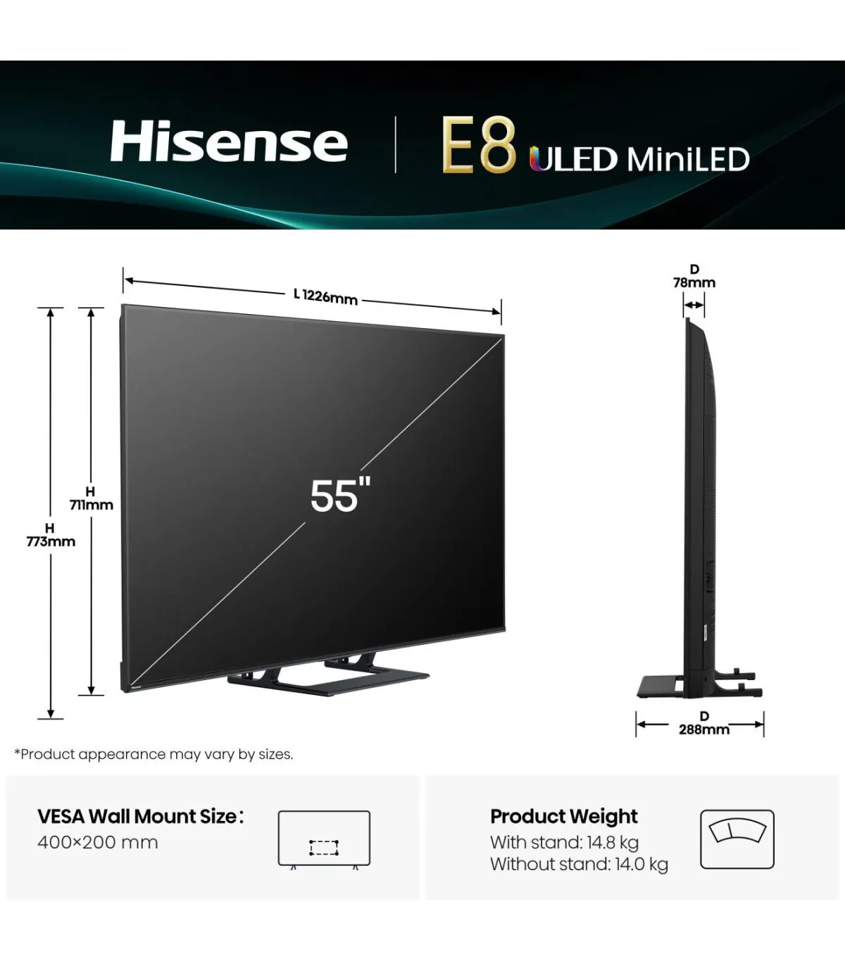 Découvrez le téléviseur Hisense 55E8Q, un écran 55" (139 cm) 4K UHD (3840 x 2160) MiniLED qui sublime votre salon. Son design ultra-fin aux bords minimalistes met en valeur une image éclatante grâce au rétroéclairage MiniLED, au contraste puissant et à une couverture étendue des couleurs pour des films et séries d’un réalisme saisissant. Le processeur haute performance optimise chaque scène, tandis que le son immersif avec compatibilité Dolby renforce l’impact home cinéma. Profitez d’une expérience connectée fluide avec VIDAA (système d’exploitation Smart TV), offrant un accès rapide à vos applications et contenus préférés. Côté connectique, vous bénéficiez de HDMI, USB, sortie audio, entrée antenne, port Ethernet, ainsi que du Wi‑Fi et du Bluetooth pour un appairage simplifié avec barres de son, casques et manettes. Avec ses ports multiples et ses performances d’image et de son abouties, c'est le choix idéal pour le cinéma à domicile, le sport et le streaming au quotidien.