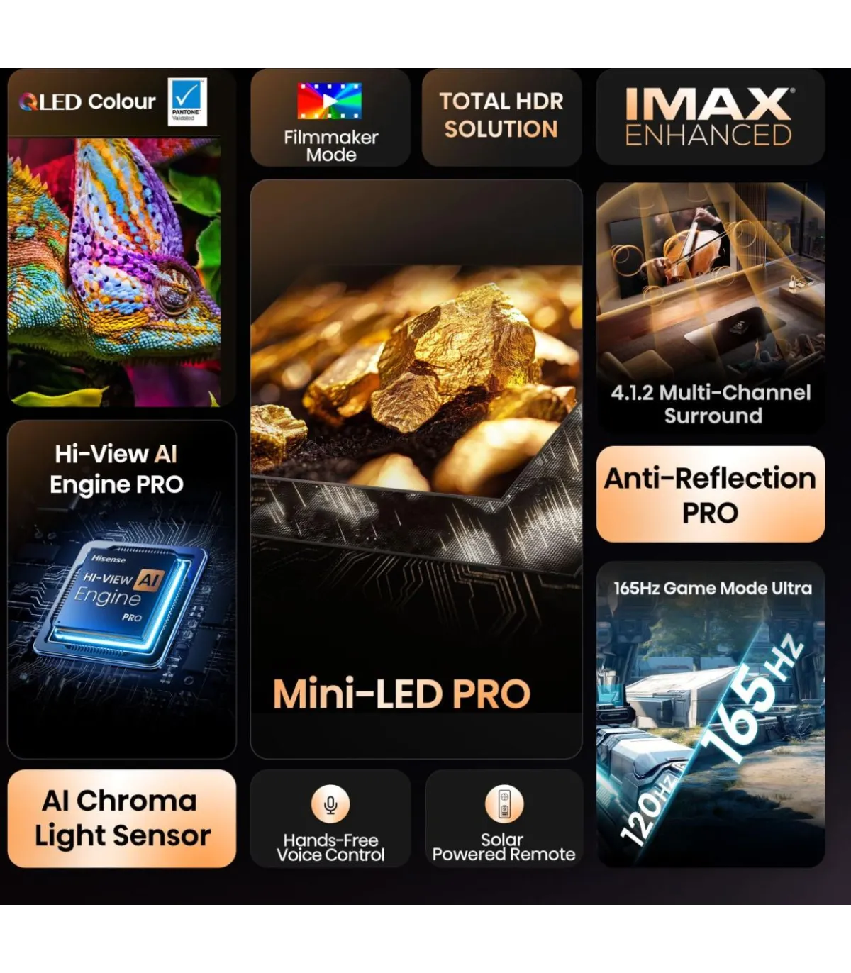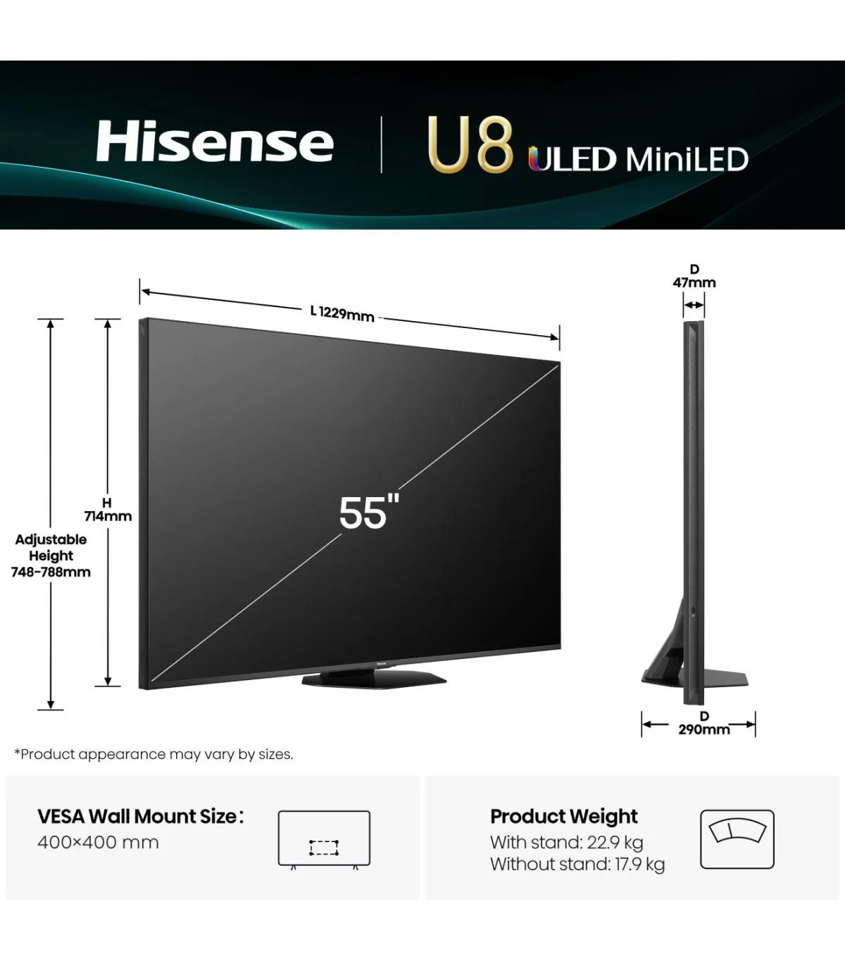 Découvrez le téléviseur Hisense 55U8Q 55" 4K UHD MiniLED, pensé pour sublimer votre home cinéma. Son design élégant aux bordures fines met en valeur une dalle 55" (139 cm), idéale pour une immersion totale. La technologie MiniLED et le 4K UHD (3840 x 2160) offrent un contraste profond, des noirs précis et des couleurs éclatantes, optimisés par le processeur d’image puissant pour une fluidité remarquable. Profitez d’un son enveloppant grâce aux haut-parleurs intégrés et aux formats audio avancés. La plateforme Smart TV VIDAA garantit une navigation rapide, des applications populaires et un contrôle intuitif. Côté connectique, bénéficiez de HDMI, USB, sortie audio, entrée antenne et port Ethernet pour toutes vos sources. La connectivité Wi‑Fi et Bluetooth assure un streaming sans fil fluide et l’appairage de vos barres de son et casques. Avec ses performances d’image, son traitement vidéo et sa résolution 4K, le Hisense 55U8Q devient le cœur de votre salon, prêt pour films, séries et gaming.