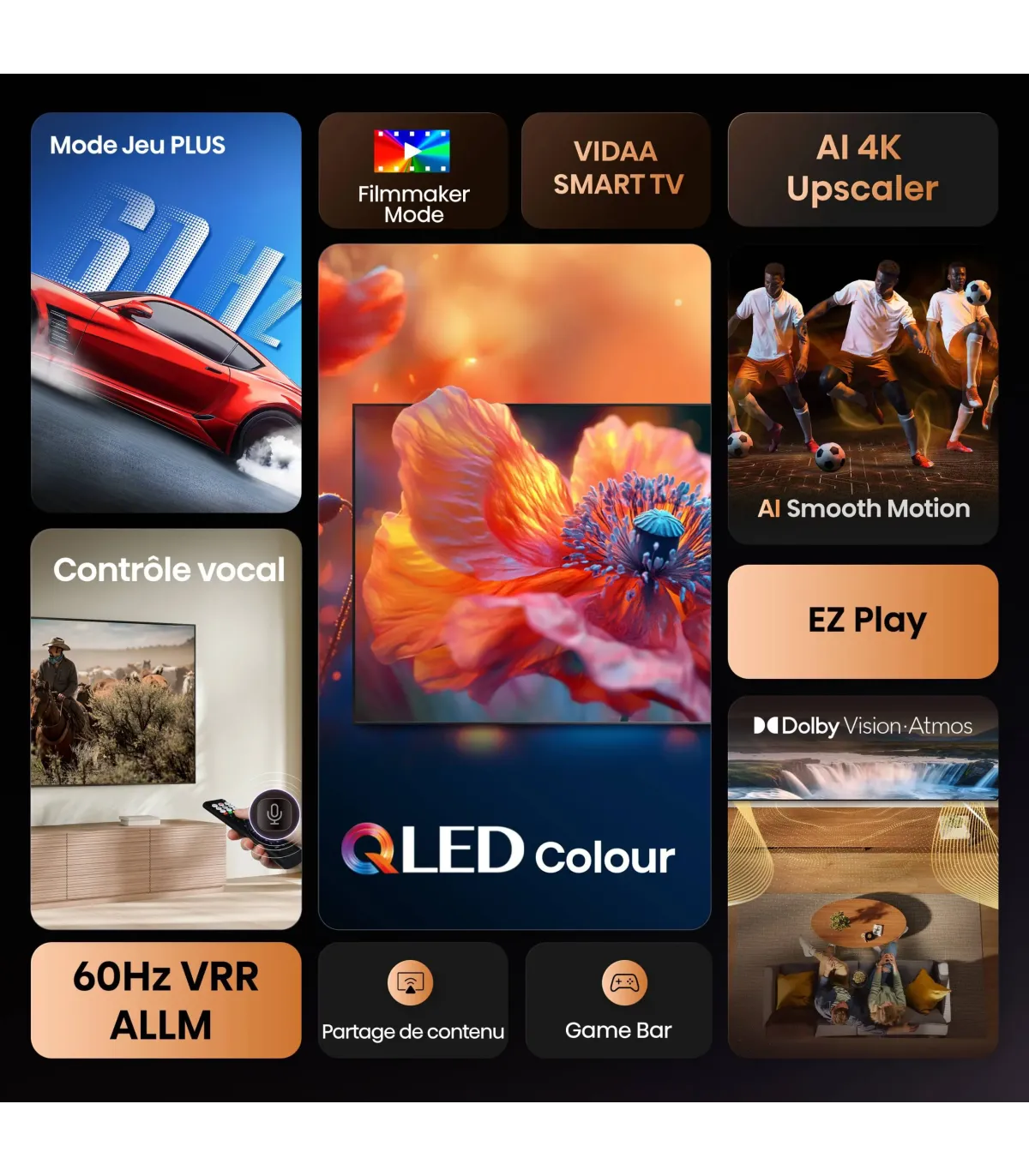 Le processeur vidéo dédié orchestre l’upscaling 4K, l’optimisation des contrastes et l’extension colorimétrique propre au QLED, garantissant des ajustements rapides et précis. Les visages, textures fines et arrière-plans complexes profitent d’une analyse intelligente, pour une image plus propre et plus lisible, même sur des flux compressés.
