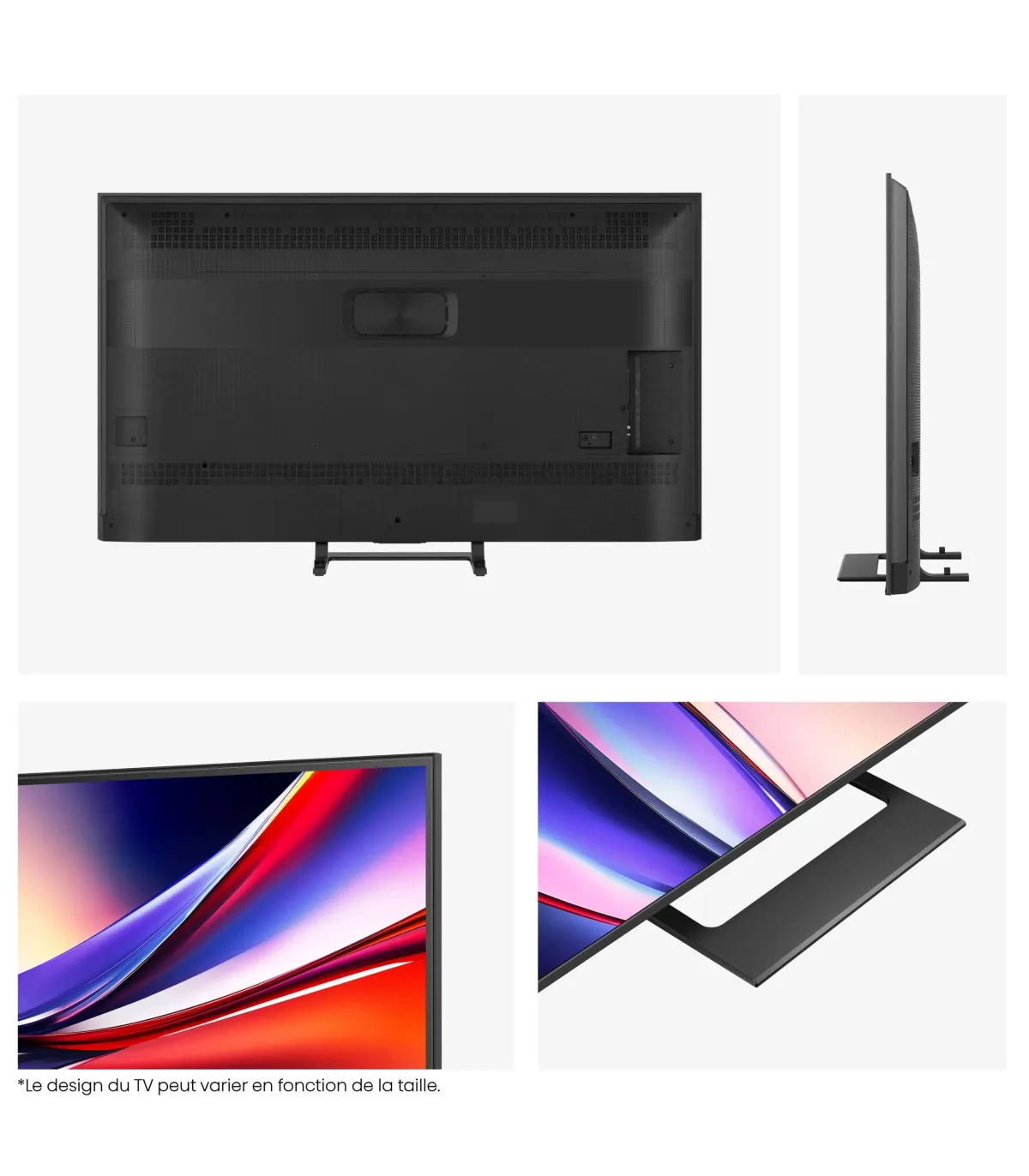 Le téléviseur Hisense 65A7Q se distingue par une esthétique soignée qui valorise tous les intérieurs home cinéma. Sa dalle de 65 pouces (164 cm) occupe une façade aux bords affinés, posée sur un pied central stable et discret qui facilite l’intégration sur meuble. La construction mince favorise une pose murale élégante et maîtrisée via une fixation VESA 300 x 200, tout en conservant un accès aisé à la connectique. L’ensemble respire la qualité perçue, avec une attention portée au maintien de la rigidité et à la diffusion optimale de l’image dans un salon moderne.