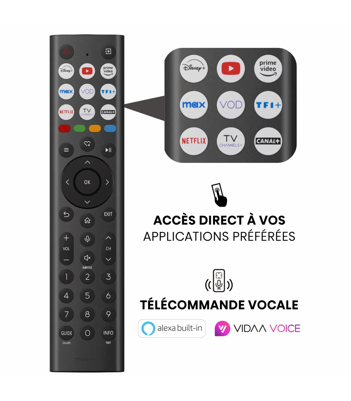 Doté du système Smart TV VIDAA, l’interface propose une navigation rapide, des menus clairs et un accès immédiat aux principales plateformes de streaming. La personnalisation de l’écran d’accueil et la recherche simplifiée offrent une expérience fluide, tandis que les mises à jour assurent la pérennité des services. Le contrôle vocal et la compatibilité avec les écosystèmes de la maison connectée facilitent l’usage quotidien.