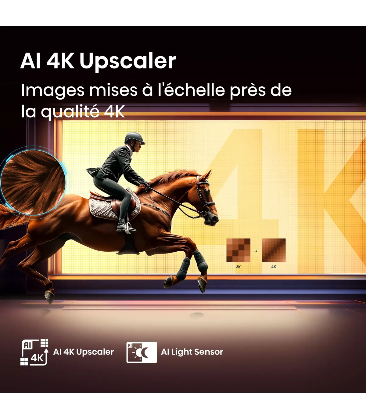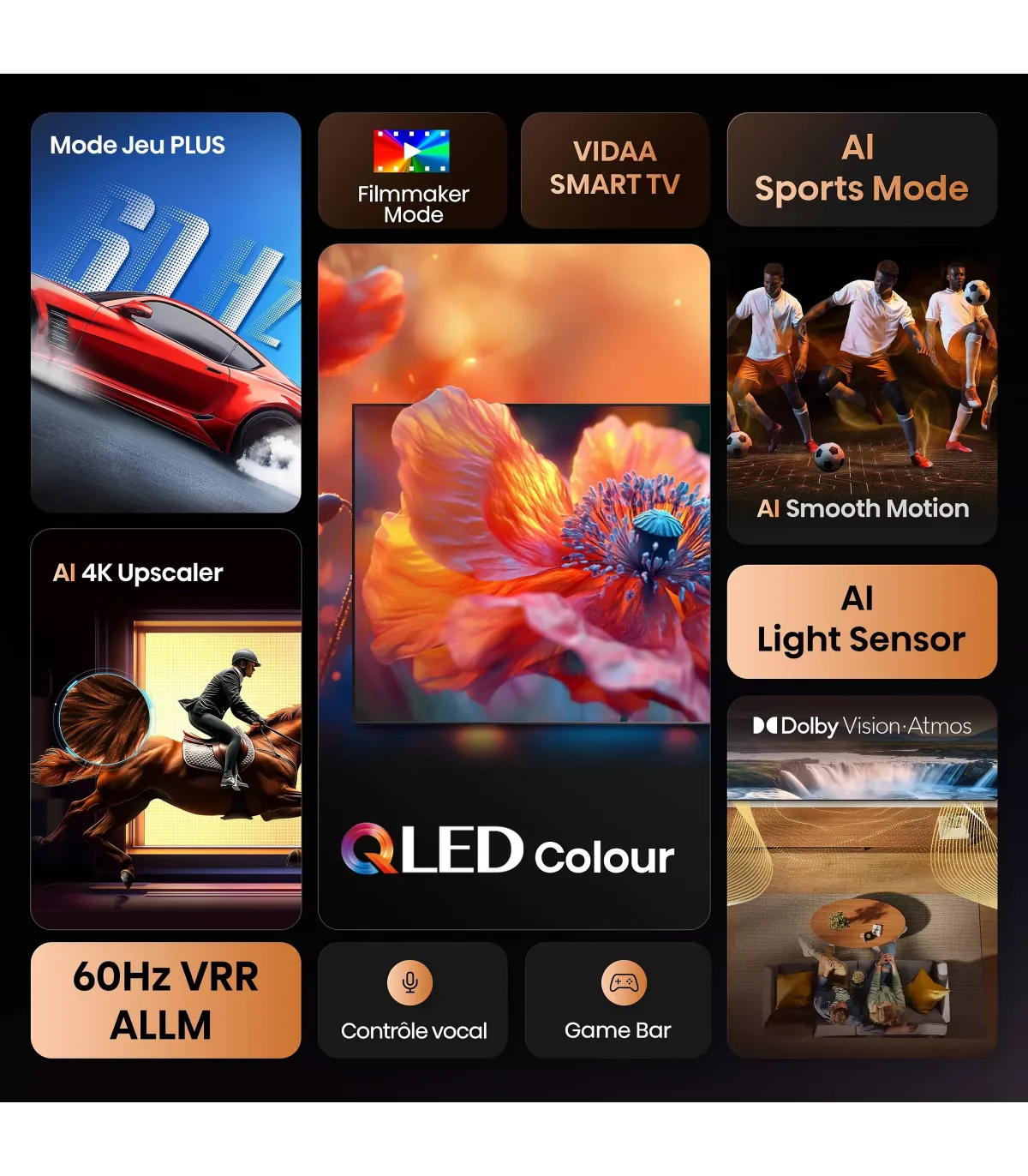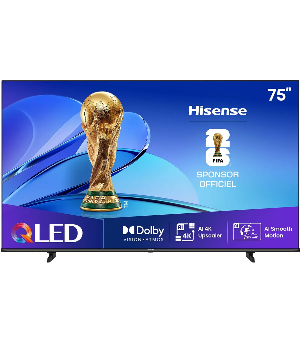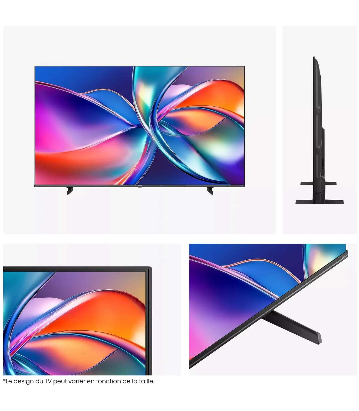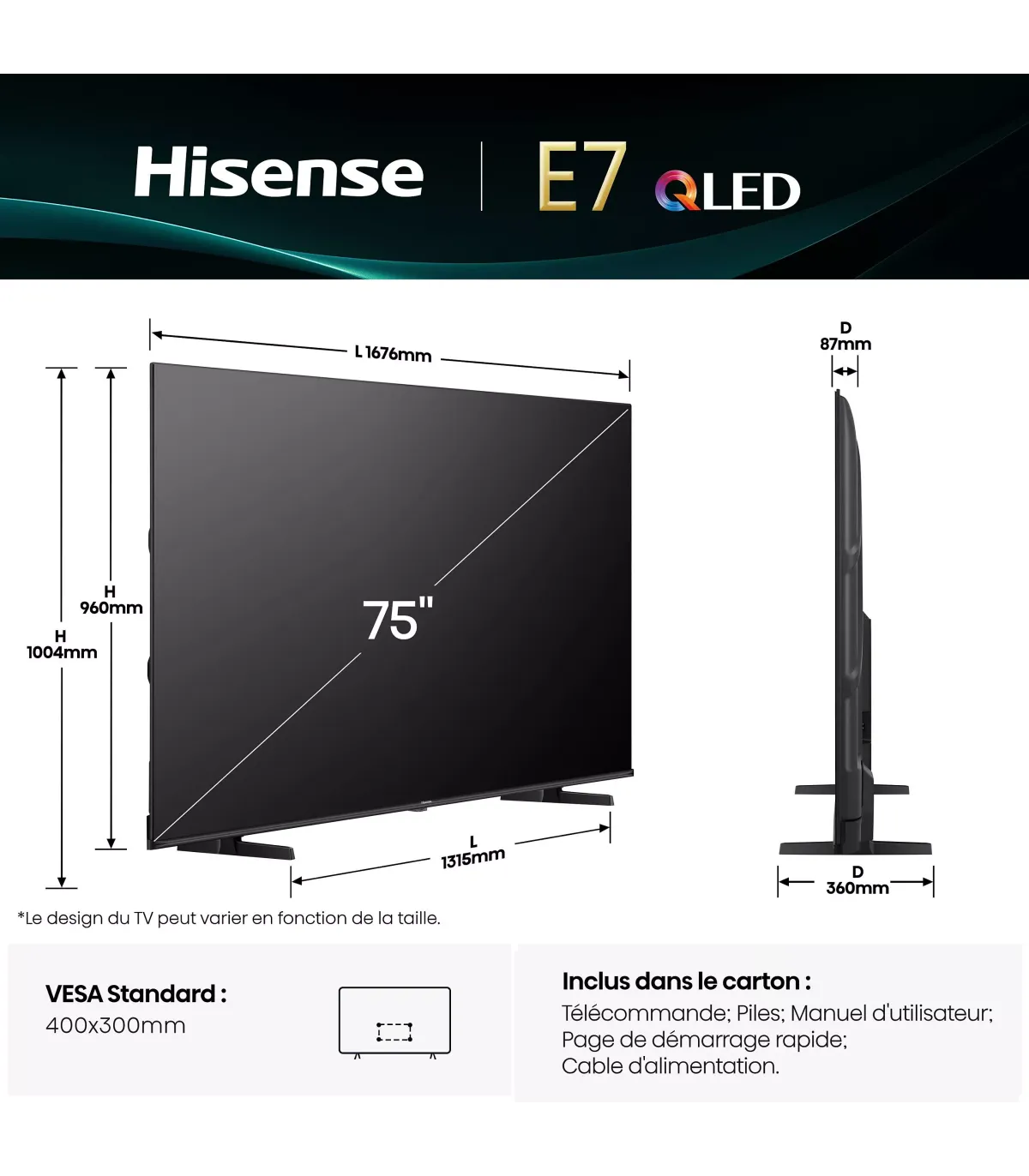 Plongez au cœur du spectacle avec le Hisense 75E7Q Pro. Son design bords fins et son pied élégant subliment votre salon home cinéma. La dalle 75" (190,5 cm) offre une image 4K (3840 x 2160) d’une précision renversante, portée par la technologie QLED, une couverture large du gamut, des contrastes profonds et une haute luminosité pour des couleurs éclatantes. Le processeur Hi‑View Engine optimise en temps réel la netteté, le mouvement et l’upscaling, tandis que le son Dolby Atmos délivre une scène audio immersive. Côté Smart TV, profitez d’une navigation fluide sous VIDAA U avec vos applications préférées. Connectivité complète: Wi‑Fi double bande, Bluetooth, HDMI (multiples ports), USB, entrée antenne, port optique, Ethernet, CI+, sortie casque. Idéal pour films, séries et sport grâce au mode jeu réactif et au motion smoothing. Offrez‑vous une expérience cinéma à domicile avec un téléviseur puissant, élégant et prêt pour tous vos contenus.
