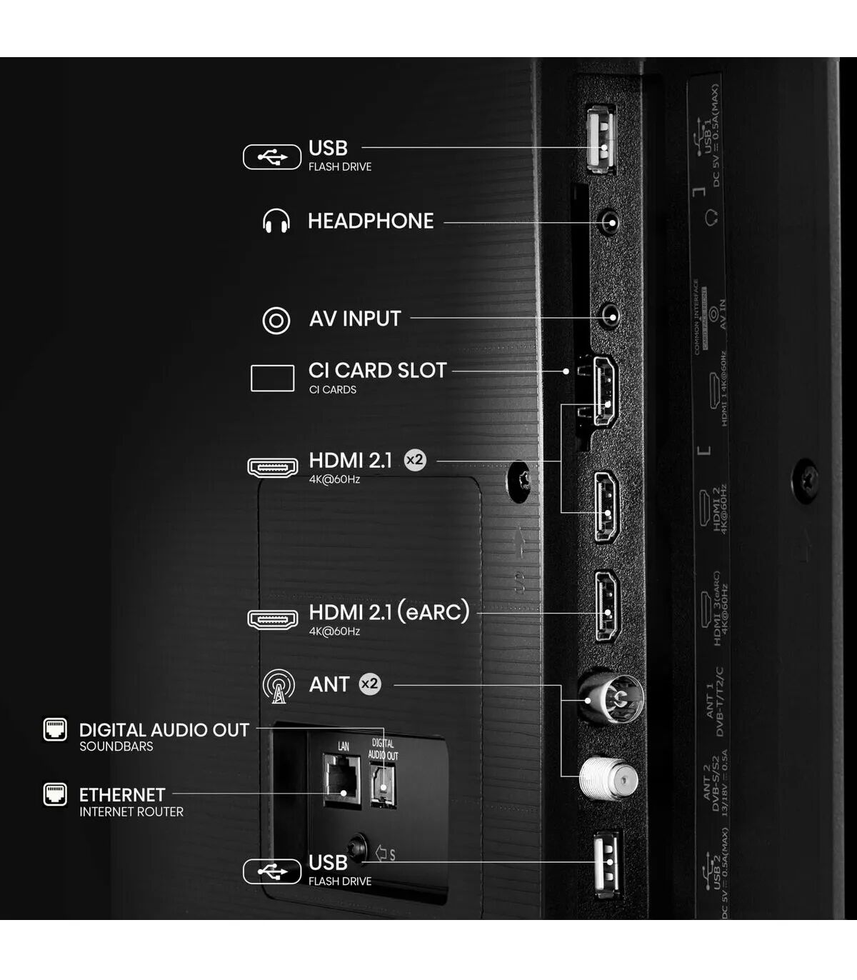 Le téléviseur intègre plusieurs ports HDMI pour les consoles et lecteurs UHD, des ports USB pour la lecture locale de médias, une sortie audio eARC, une entrée antenne et une prise réseau Ethernet. La compatibilité CEC simplifie le contrôle des appareils reliés, tandis que le tuner prend en charge la réception des chaînes numériques selon les standards actuels.