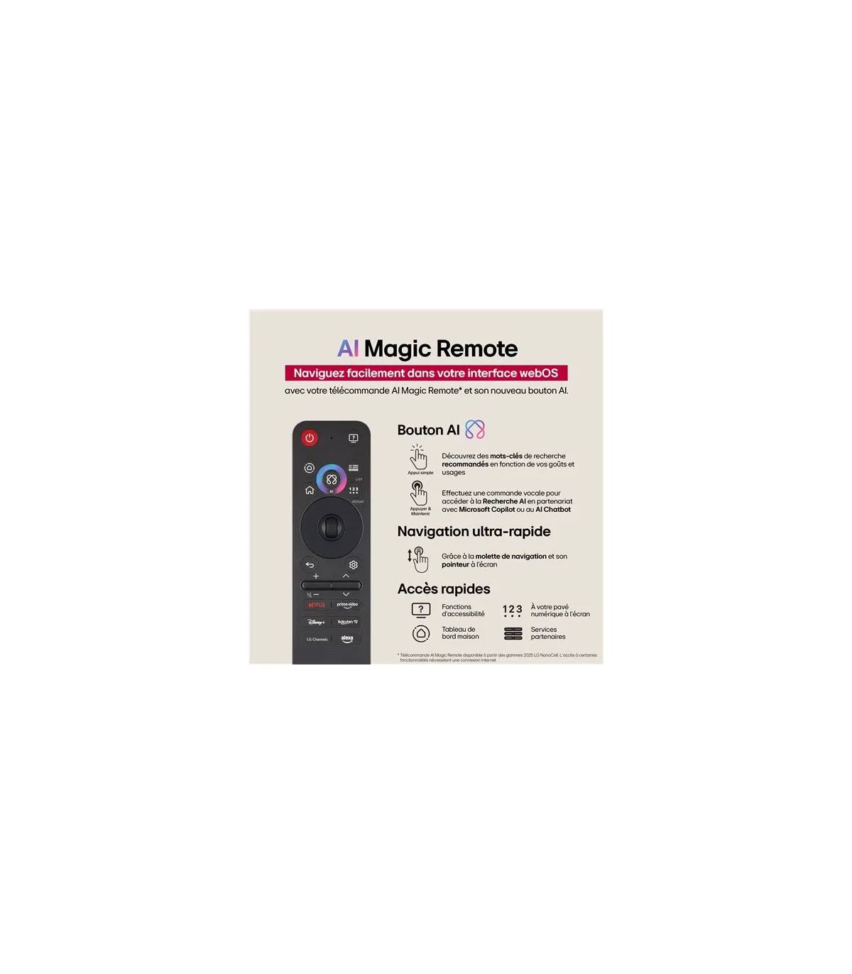 Découvrez le LG 43NANO81A6A, un téléviseur 43" élégant au design fin et moderne, parfait pour sublimer votre salon. Sa technologie NanoCell offre une image 4K UHD (3840 x 2160) d’une précision remarquable, avec des couleurs pures et un excellent contraste. Propulsé par le processeur α5 AI 4K, il optimise netteté, upscaling et fluidité. Côté son, profitez d’un rendu immersif avec AI Sound et compatibilité HDR pour des scènes plus réalistes. La plateforme webOS assure une navigation rapide, l’accès aux applications majeures et l’assistant vocal. Connectivité complète avec Wi‑Fi intégré, Bluetooth, HDMI (plusieurs ports), USB, LAN/Ethernet, sortie audio optique et CI+ pour vos équipements home cinéma et consoles. La dalle 43 pouces (108 cm) s’intègre facilement dans tous les espaces, idéale pour films, séries et sport. Bénéficiez d’une expérience Smart TV fluide, d’un contrôle intuitif et d’une connectique prête pour l’ultra haute définition grâce au LG 43NANO81A6A.
