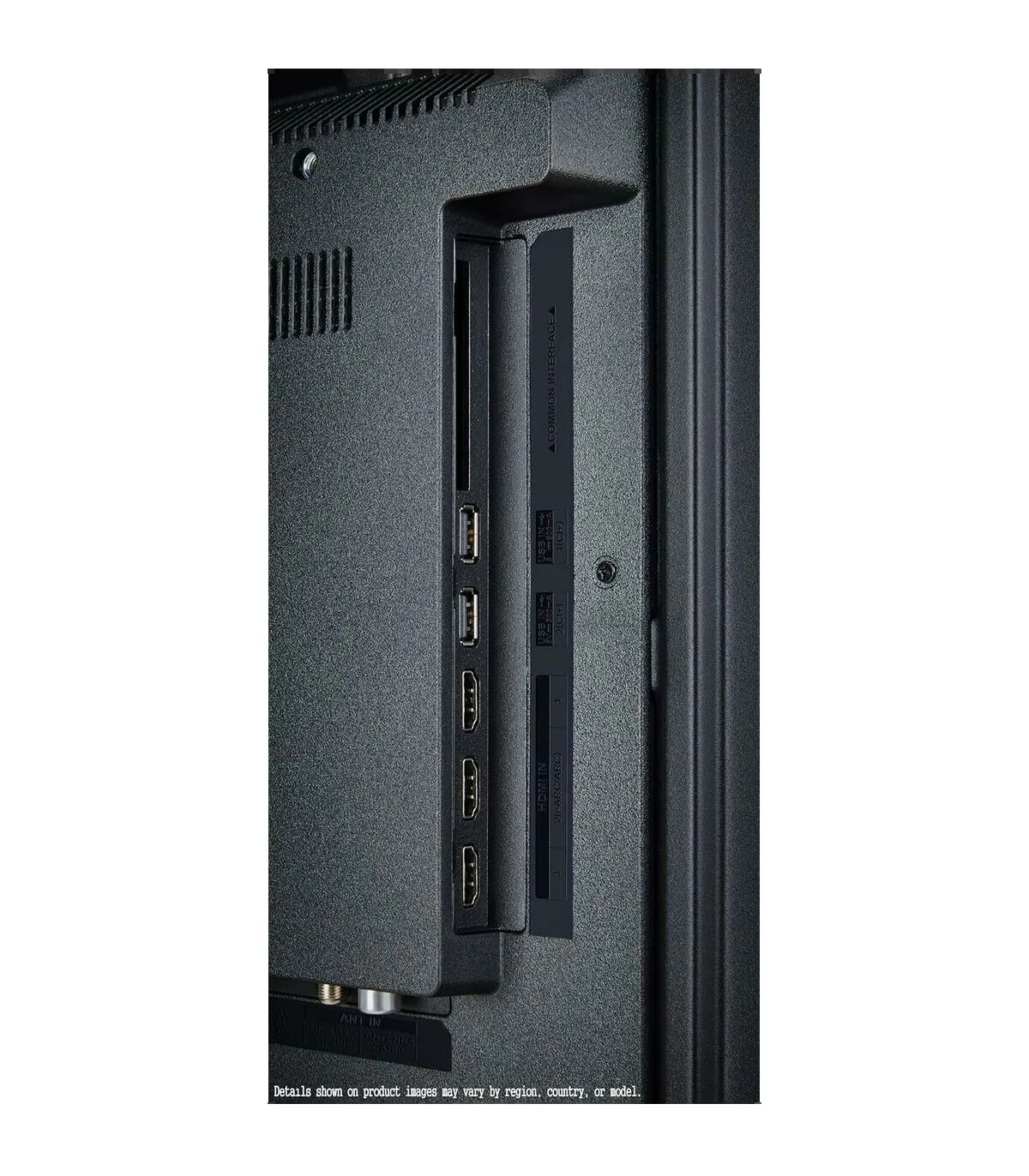 La connectique comprend 3 ports HDMI 2.0 (avec eARC/ARC), 2 ports USB 2.0, sortie optique audio et interface CI+. Wi‑Fi (802.11ac) et Bluetooth 5.1 assurent la connexion aux réseaux domestiques, aux casques ou enceintes externes. Cela permet d’ajouter une barre de son Bluetooth, d’accéder à Internet ou de connecter manette/console sans fil. Le port HDMI avec eARC permet une liaison haut‑débit vers une barre de son pour un son premium.