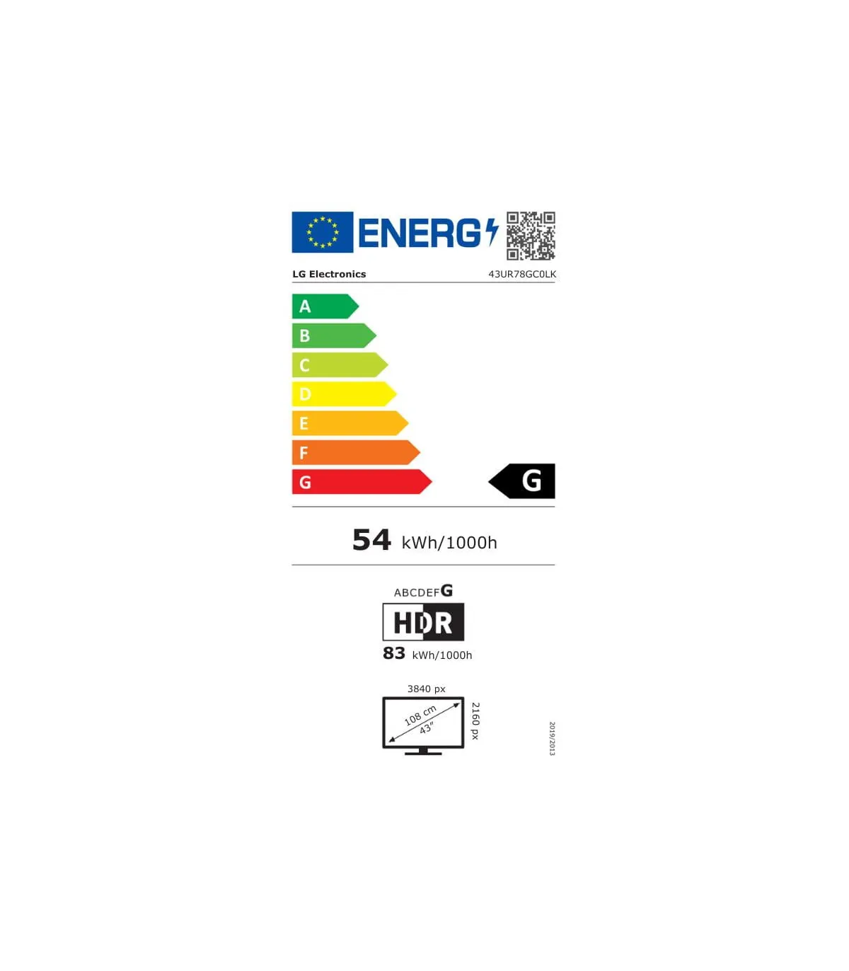 Optimisé pour une consommation maîtrisée, l’appareil répond aux exigences de la classe énergétique G (échelle UE actuelle), reflétant la performance d’un écran 4K de 43 pouces tout en privilégiant une gestion intelligente de la luminosité.
