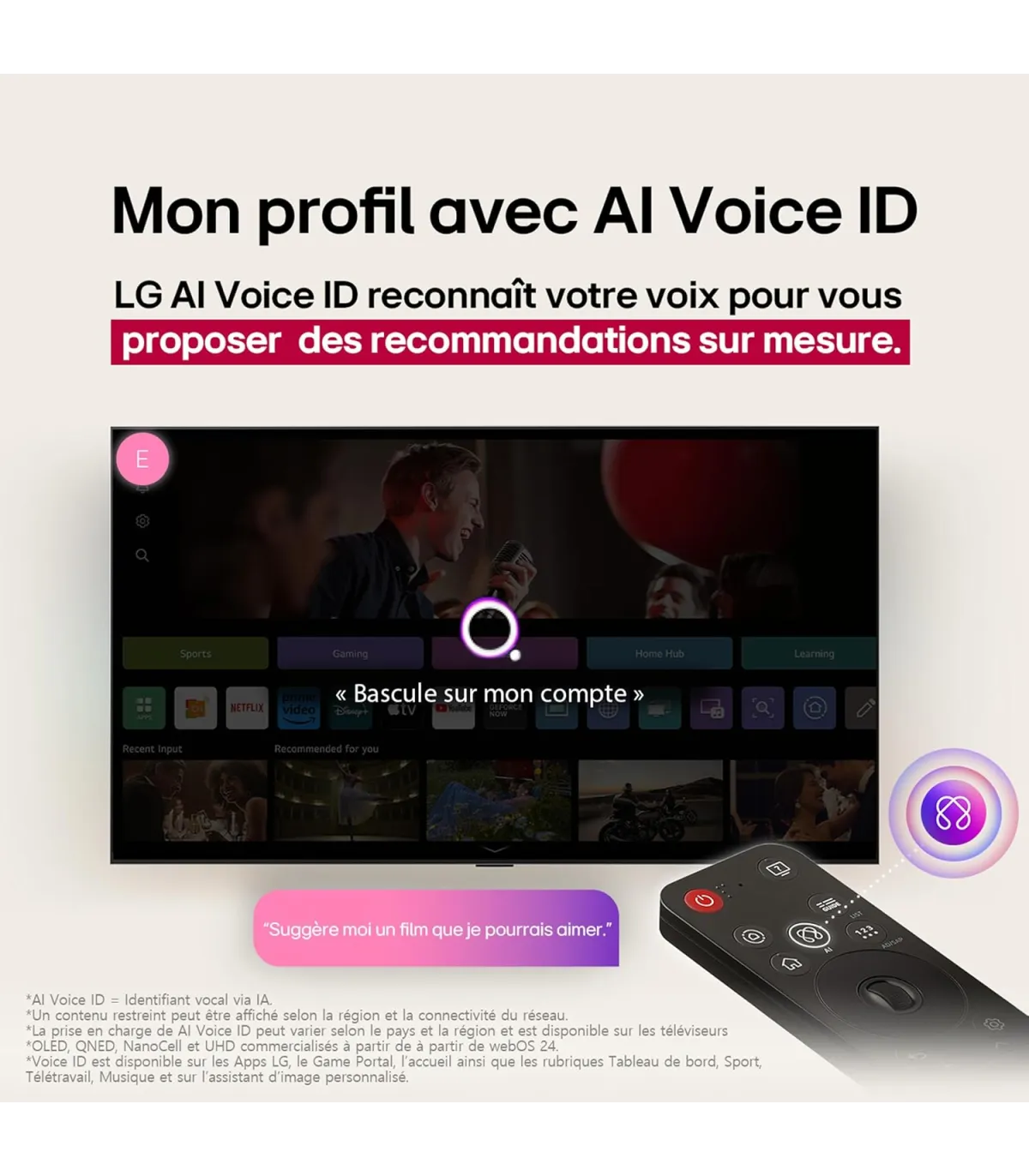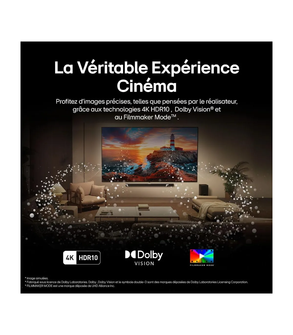 Découvrez le LG 65QNED93A6A, un téléviseur 65" (164 cm) au design slim élégant, idéal pour le home cinéma. Sa dalle 4K UHD (3840 x 2160) avec technologie QNED (Quantum Dot + NanoCell) et rétroéclairage Mini LED offre des noirs profonds, un contraste précis et des couleurs éclatantes, sublimés par le processeur α7 AI 4K. Profitez d’images fluides avec HDR10 / HLG / Dolby Vision et d’un son immersif grâce au Dolby Atmos et à l’IA Sound Pro. L’interface webOS garantit une navigation rapide avec toutes vos applis de streaming. Côté connectique, bénéficiez de 4x HDMI (dont HDMI 2.1 pour jeu en 4K 120 Hz), 2x USB, sortie optique, port Ethernet, CI+, RF. La connectivité sans fil inclut Wi‑Fi et Bluetooth pour une installation simple et un partage aisé. Parfait pour films, séries et jeux, il combine performances, smart TV complète et esthétique soignée pour sublimer votre salon.