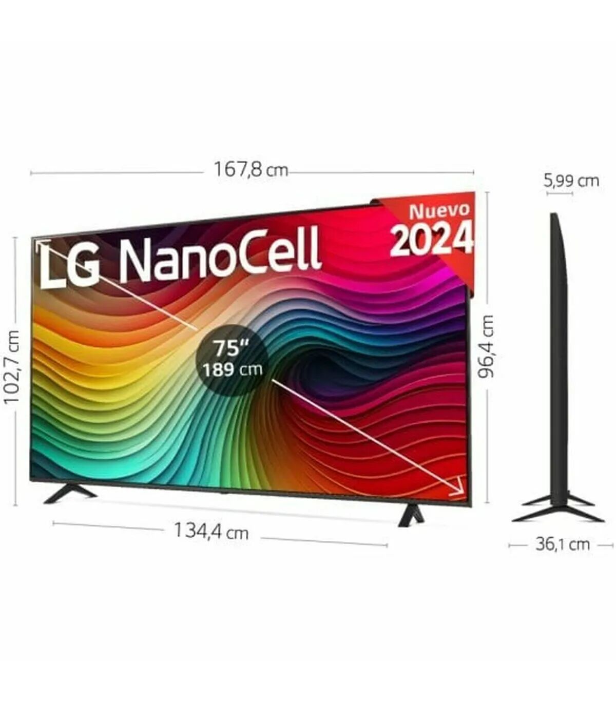 Le LG 75NANO82T6B allie un design élégant à un affichage performant : il présente une taille : 75 pouces, un design fin et élégant (cadre noir, profil mince) pour s’intégrer harmonieusement dans votre salon. Côté image : bénéficie d’une dalle Ultra HD 4K (3840 × 2160) avec technologie NanoCell, optimisée par le processeur α5 AI 4K Gen7 pour des couleurs précises et un rendu fluide. Le son est assuré par un système 2.0 canaux (20 W) avec fonctions AI Sound Pro / Clear Voice Pro, pour un accompagnement audio immersif. Il fonctionne sous le système d’exploitation webOS 24, garantissant une navigation fluide et un accès aux applications streaming. En connectique il dispose de 3 ports HDMI (dont un eARC), 2 ports USB, Ethernet LAN, Wi-Fi 5 et Bluetooth 5.1. Ce modèle propose ainsi une excellente solution « tout-en-un » pour la maison, tant pour les films que le gaming ou le streaming.