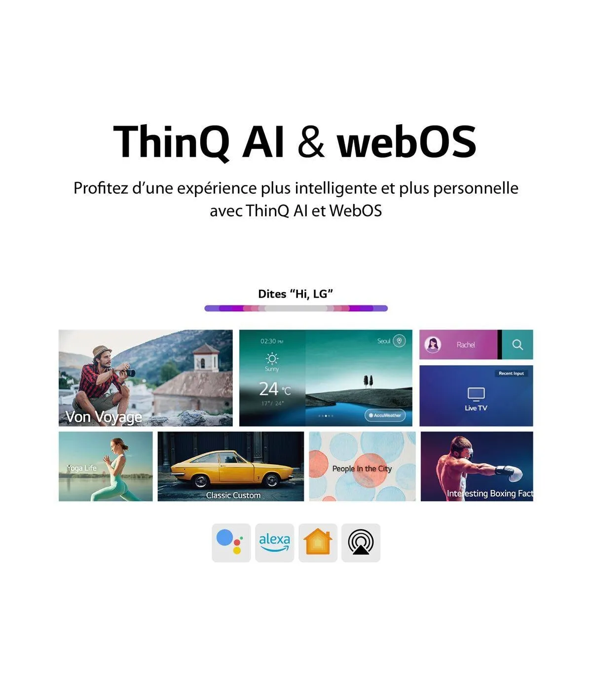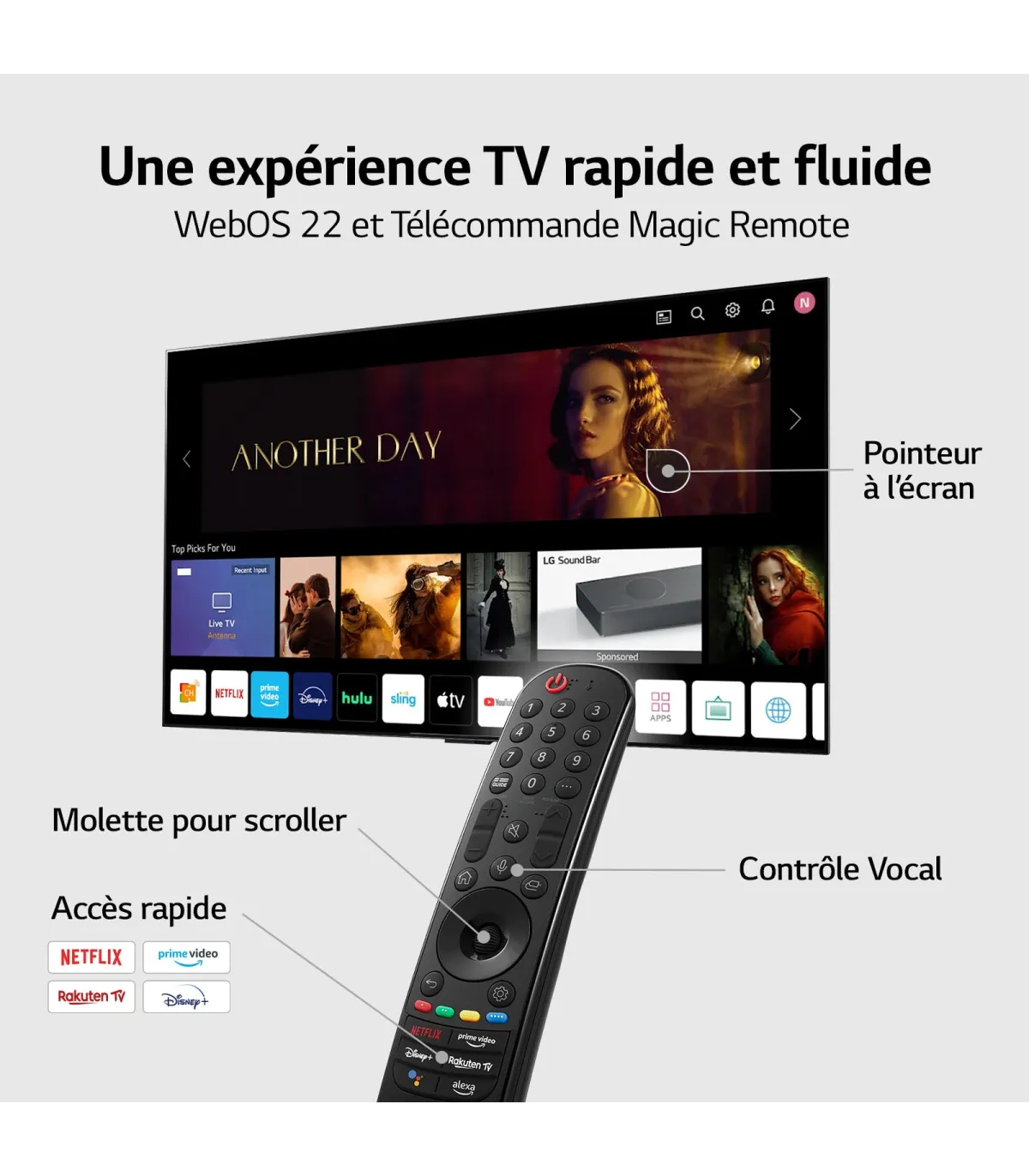 Le téléviseur fonctionne sous WebOS, le système d’exploitation intuitif et fluide de LG. Cette interface conviviale permet un accès rapide à vos applications favorites comme Netflix, Disney+, Prime Video ou YouTube. Le contrôle par commandes vocales et l’intégration de l’IA facilitent la navigation et la personnalisation des contenus selon vos préférences. WebOS transforme l’usage quotidien en une expérience intelligente et agréable, en faisant du LG 86QNED91 le meilleur téléviseur cinéma maison pour ceux qui recherchent simplicité et performance.