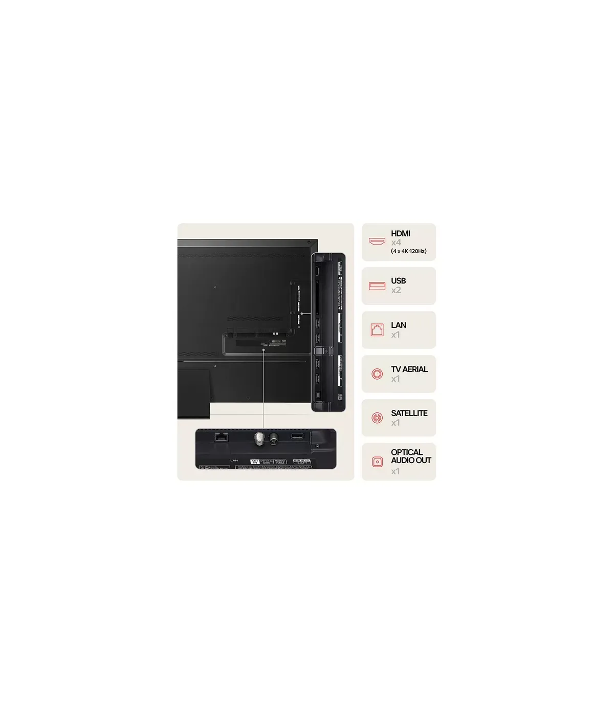 Elle propose une connectique riche et complète : 4 ports HDMI 2.1, 3 ports USB, un port Ethernet, une sortie audio optique et un port AV composite. Cette configuration permet de connecter facilement consoles, lecteurs Blu-ray, barres de son ou systèmes gaming. Les ports HDMI 2.1 supportent le 4K à 120 Hz, idéal pour les joueurs à la recherche d’une réactivité maximale et d’une fluidité parfaite. L’utilisateur profite ainsi d’une flexibilité totale pour créer un home cinéma 4K complet et personnalisable selon ses besoins.