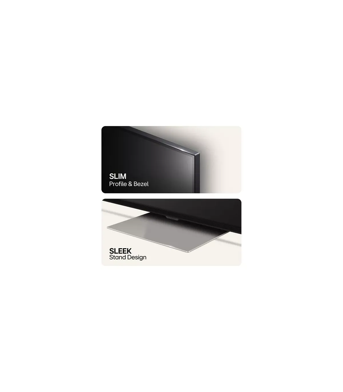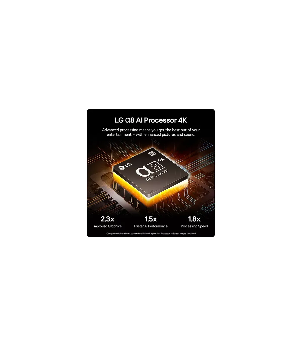 Le cœur du téléviseur repose sur le processeur α7 Gen5 AI 4K de LG, qui optimise l’image et le son en temps réel grâce à l’intelligence artificielle. La technologie AI Picture Pro améliore les détails, réduit le bruit et ajuste les couleurs, tandis que AI Sound Pro adapte le rendu audio à votre environnement. Ce processeur permet également un traitement rapide des contenus 4K, garantissant une fluidité exceptionnelle dans les scènes rapides, idéale pour les films d’action et les jeux vidéo. L’utilisateur bénéficie d’une performance maximale et d’une expérience cinéma à domicile sans compromis.