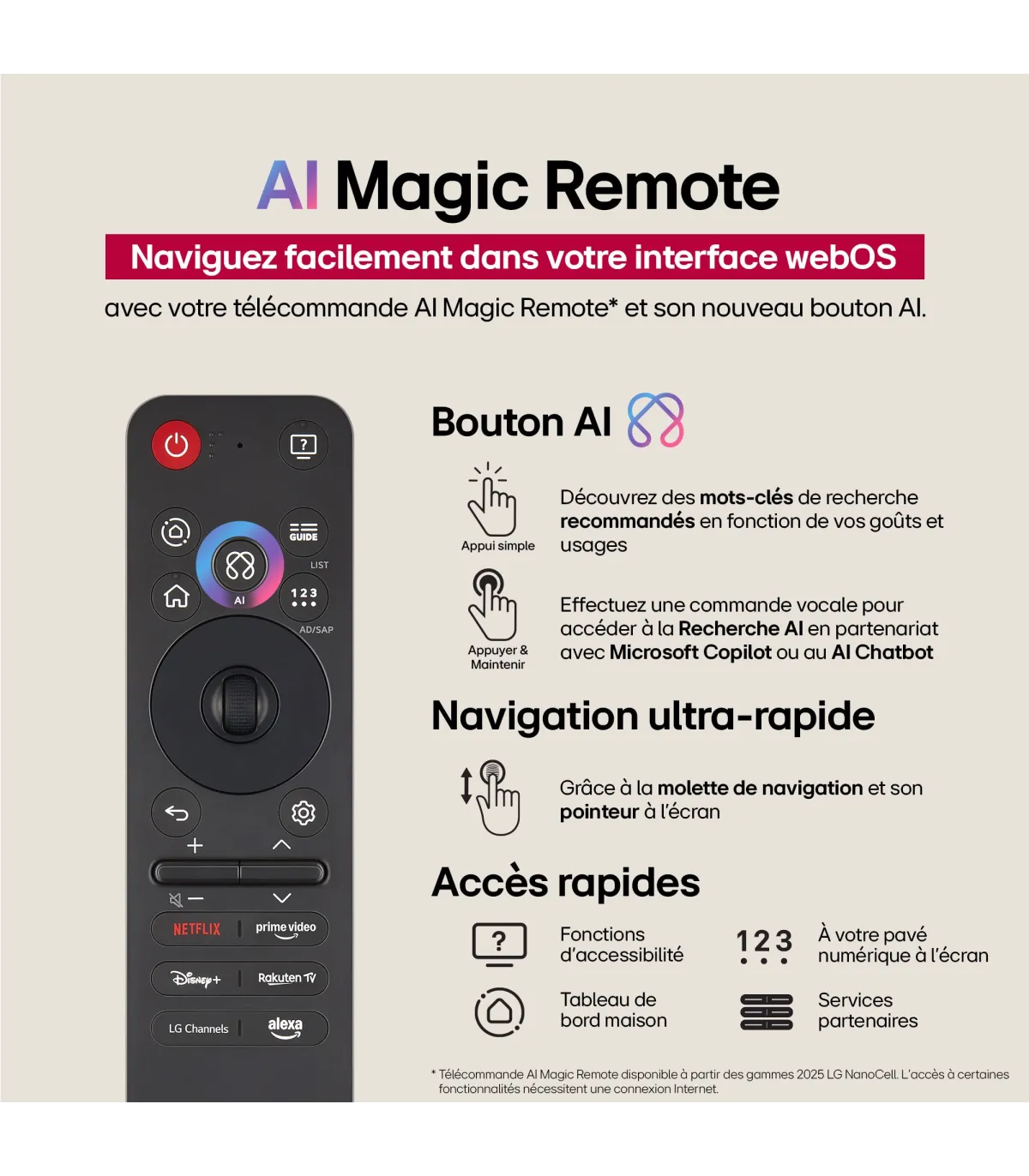 Découvrez le LG OLED65G54LW, un téléviseur 65" qui sublime votre salon avec une image 4K d’une précision exceptionnelle grâce à sa dalle OLED aux noirs parfaits et à la technologie HDR (Dolby Vision) pour des couleurs riches et un contraste saisissant. Profitez d’une expérience cinéma à domicile fluide avec une fréquence de rafraîchissement 120 Hz, idéale pour les films, le sport et le gaming. Son système Smart TV (webOS) offre un accès instantané à vos applications de streaming, assistants vocaux et contenus personnalisés. La connectivité complète avec HDMI, Wi‑Fi et Bluetooth assure une installation simple de vos consoles, barres de son et appareils mobiles. Son design ultra-fin et moderne s’intègre élégamment à tout intérieur, tandis que le son immersif compatible Dolby Atmos renforce le réalisme. Optez pour ce téléviseur 4K UHD haut de gamme pour une qualité d’image immersive, une navigation intuitive et des performances durables, parfaites pour transformer chaque séance en véritable spectacle.