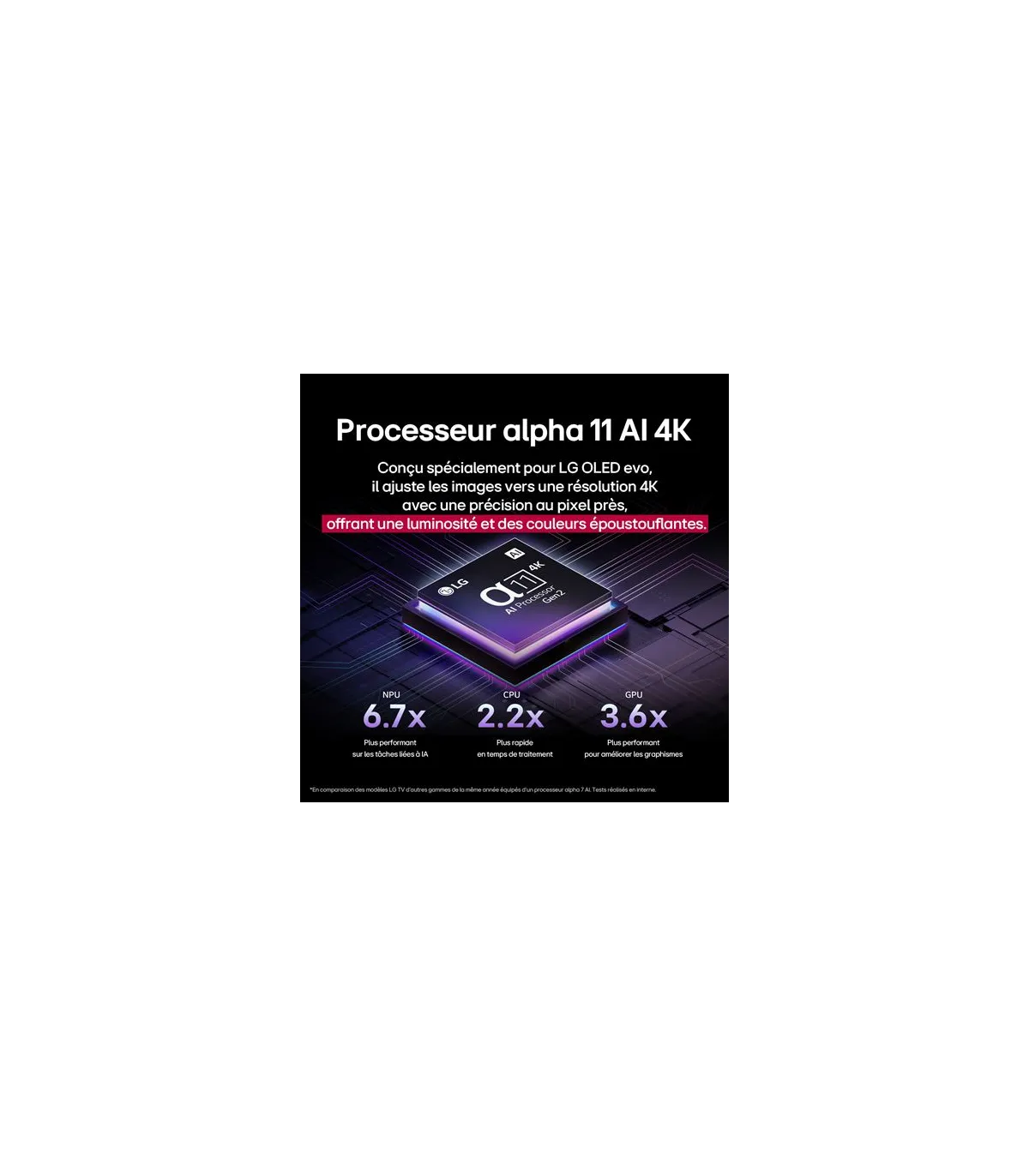 Découvrez le LG OLED77G54LW 77" et transformez votre salon en salle de cinéma: sa dalle OLED 4K UHD (3840 x 2160) offre des noirs parfaits, des couleurs riches et un contraste infini pour une qualité d’image immersive, renforcée par les formats HDR10 / Dolby Vision. Profitez d’une action ultra-fluide grâce au taux de rafraîchissement 120 Hz, idéal pour les films, le sport et le gaming nouvelle génération. Le système Smart TV webOS garantit une navigation rapide entre vos applications de streaming, avec assistants vocaux intégrés pour un contrôle simple. Côté connectivité, bénéficiez de HDMI 2.1, Wi‑Fi et Bluetooth pour brancher consoles, barres de son et périphériques sans effort. Son design Gallery au profil ultra-fin s’intègre harmonieusement à votre mur pour un look moderne et épuré. Avec un traitement d’image avancé, un upscaling précis et un mode Filmmaker, ce téléviseur OLED offre une expérience cinéma à domicile, une fluidité remarquable et une compatibilité complète avec les contenus 4K HDR, le tout taillé pour la performance et le plaisir visuel au quotidien.