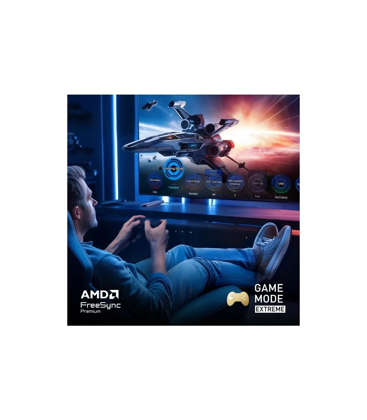 Le téléviseur propose un mode « Game Mode Extreme », avec prise en charge HDMI 2.1 (entrées compatibles), VRR (Variable Refresh Rate), ALLM (Auto Low Latency Mode) et fréquence jusqu’à 120 Hz. Ces caractéristiques permettent une latence réduite et une superbe fluidité pour consoles ou PC gaming. La connectique inclut notamment 3 ports HDMI, 2 ports USB, une entrée Ethernet (LAN) et une sortie audio optique. Le modèle est prêt pour une installation complète mêlant divertissement, console et multimédia.