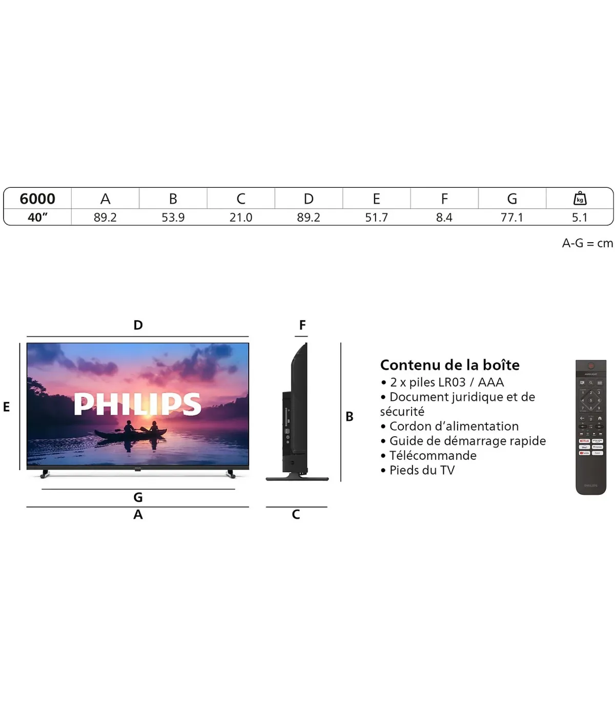 Découvrez le Philips 40PFS6000/12, un téléviseur 40" (102 cm) au design fin et élégant qui s’intègre parfaitement à votre salon. Profitez d’une image Full HD (1920 x 1080) lumineuse et détaillée, portée par un processeur d’image Philips optimisant contraste, netteté et mouvements pour vos films et séries. Le son clair et équilibré accompagne vos séances home cinéma, avec des haut-parleurs conçus pour une restitution audio précise. Accédez à vos contenus favoris grâce au système Titan OS simple et intuitif. La connectique complète inclut HDMI, USB, entrée antenne, sortie audio et Ethernet, pour brancher console, lecteur et barre de son en toute simplicité. La connectivité Wi‑Fi facilite le streaming, tandis que le Bluetooth permet d’appairer casque ou enceinte sans fil. Avec son format polyvalent, sa dalle LED et ses ports HDMI/USB pratiques, c'est le choix idéal pour une expérience TV fluide, moderne et performante.