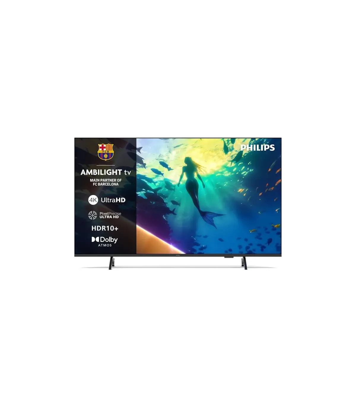 Découvrez le Philips Ambilight 50PUS8010, un téléviseur 50" (127 cm) au design épuré bord à bord, pensé pour le home cinéma. Profitez d’une image 4K UHD (3840 x 2160) éclatante, sublimée par le processeur Picture/AI Philips et l’Ambilight pour une immersion spectaculaire. Les formats HDR pris en charge et le traitement vidéo précis assurent des noirs profonds, des couleurs riches et une fluidité remarquable. Côté audio, bénéficiez d’un son clair et puissant optimisé par le traitement DTS/AI pour vos films, séries et jeux. La Smart TV sous Titan OS offre un accès rapide à vos applications préférées, avec une navigation fluide. Connectivité complète: Wi‑Fi, Bluetooth, HDMI, USB, sortie audio optique, entrée antenne, Ethernet. Grâce à ses ports HDMI compatibles UHD, profitez de vos consoles et lecteurs 4K avec une latence maîtrisée. Installation facile, pied stable et finition premium: il s’intègre parfaitement à votre salon pour une expérience cinéma à domicile, simple, élégante et performante.