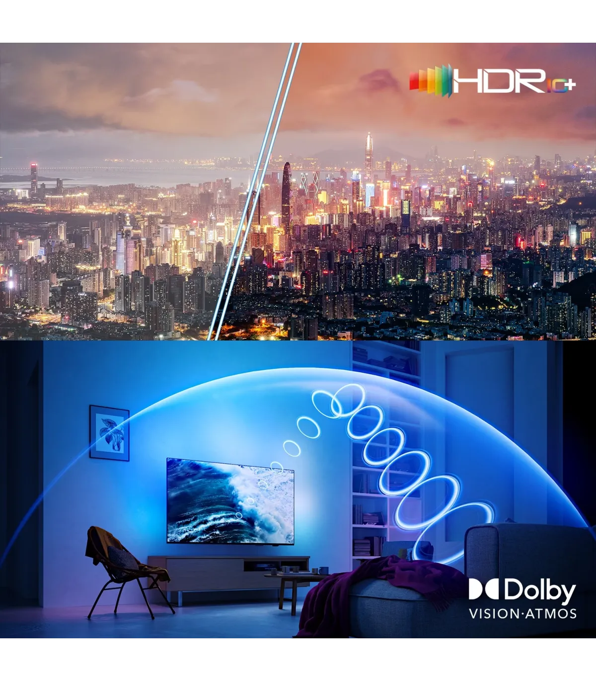 Découvrez le Philips Ambilight 55OLED910, un téléviseur 55" conçu pour le home cinéma. Son design épuré et premium sublime votre salon, tandis que l’Ambilight enveloppe l’écran d’un halo lumineux immersif. La dalle OLED 55" (139 cm) offre des noirs profonds et des couleurs éclatantes en 4K UHD (3840 x 2160), portée par un processeur puissant pour un upscaling précis et un mouvement fluide. Le système audio immersif délivre un son clair et ample, idéal pour films, séries et jeux. Profitez d’une interface fluide avec Google TV (Smart TV), l’accès aux principales applications et l’assistant vocal. Côté connectique: HDMI, USB, sortie audio optique, entrée antenne, port Ethernet, pour relier console, barre de son et lecteurs. Restez connecté avec le Wi‑Fi rapide et le Bluetooth pour vos casques et enceintes. Un concentré de performance et d’élégance pour une expérience cinéma à domicile. Ports disponibles: HDMI, USB, optique, Ethernet, antenne. Wi‑Fi et Bluetooth: Wi‑Fi, Bluetooth.