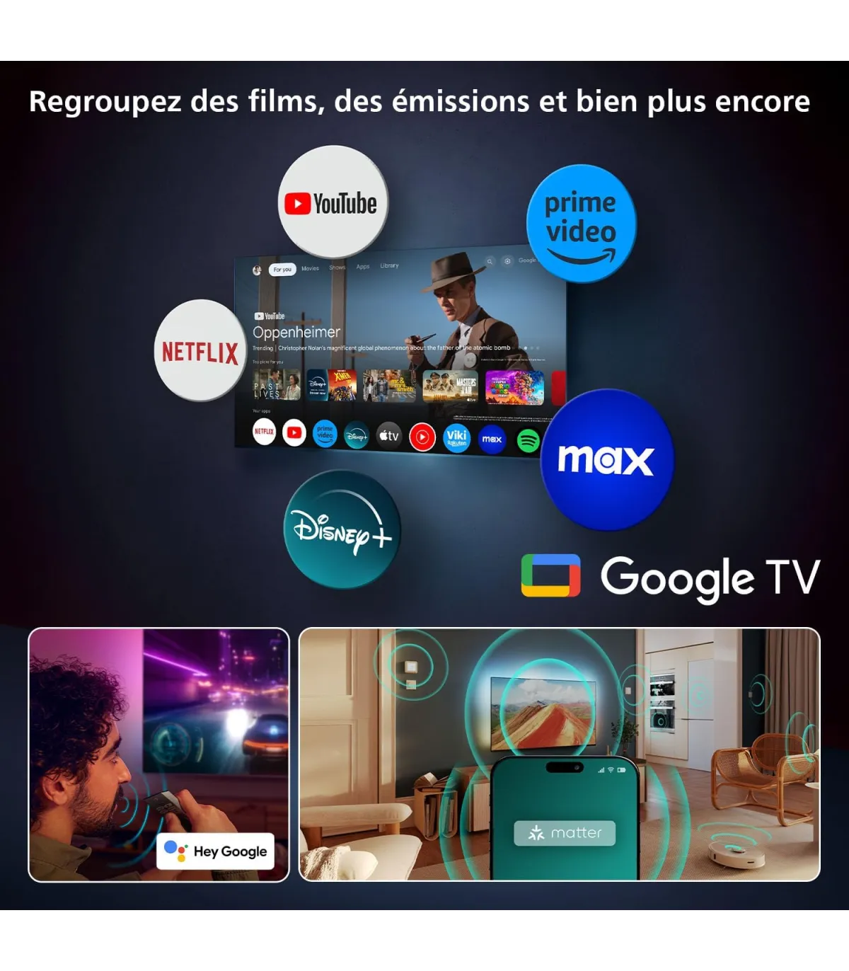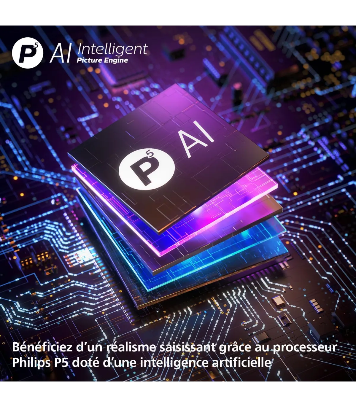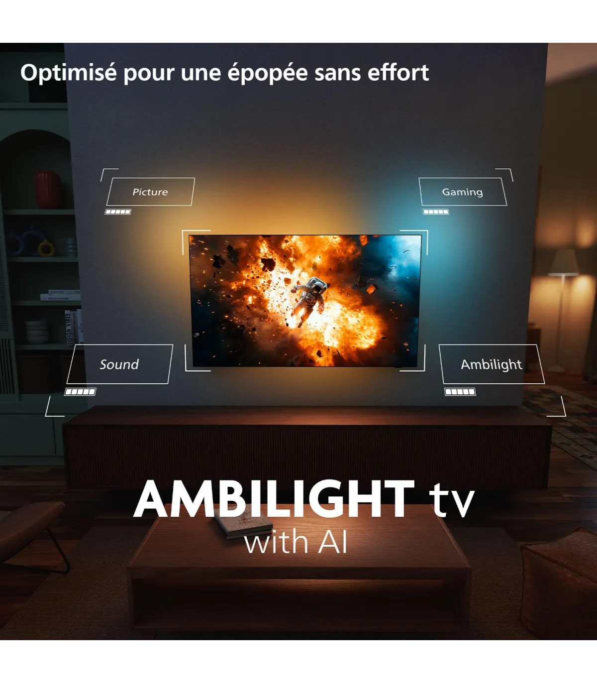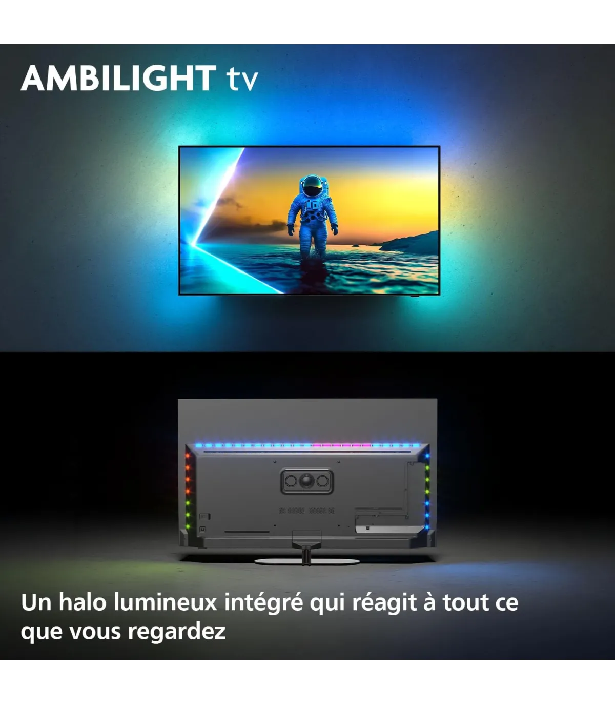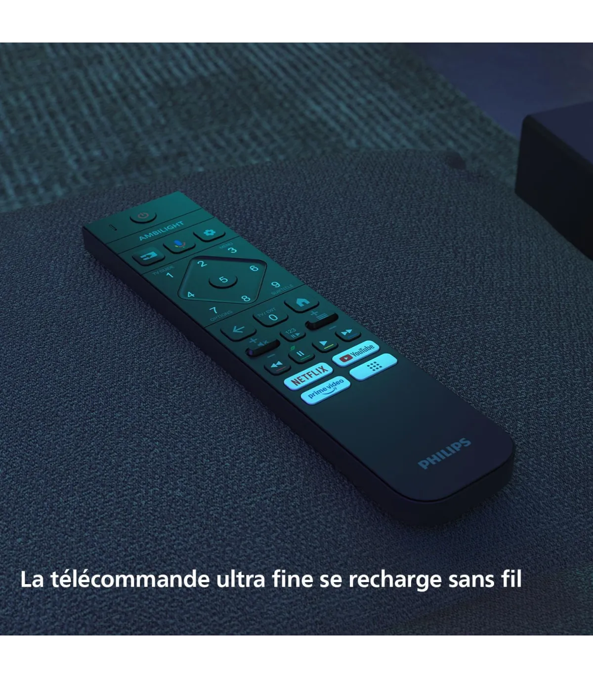Plongez au cœur de l’action avec le Philips Ambilight 77OLED820, un téléviseur 77" (195 cm) 4K UHD qui sublime votre salon home cinéma. Son design ultra-fin et ses bordures discrètes mettent en valeur une dalle OLED 4K (3840 x 2160) aux noirs absolus et aux couleurs éclatantes, portée par le processeur P5 AI pour une image d’une précision exceptionnelle. L’éclairage Ambilight enveloppe l’écran pour une immersion totale. Côté son, profitez d’un audio riche et clair avec prise en charge Dolby Atmos. Smart TV fluide et intuitive sous Titan OS, avec Wi‑Fi intégré et Bluetooth pour connecter facilement vos appareils. Connectique complète: HDMI, USB, sortie audio, entrée antenne, Ethernet, optique. Compatible HDR10+ et Dolby Vision pour des contrastes saisissants. Parfait pour films, séries et gaming grâce à une réactivité exemplaire et des mouvements maîtrisés. Le Philips Ambilight 77OLED820 transforme chaque séance en spectacle, chez vous.