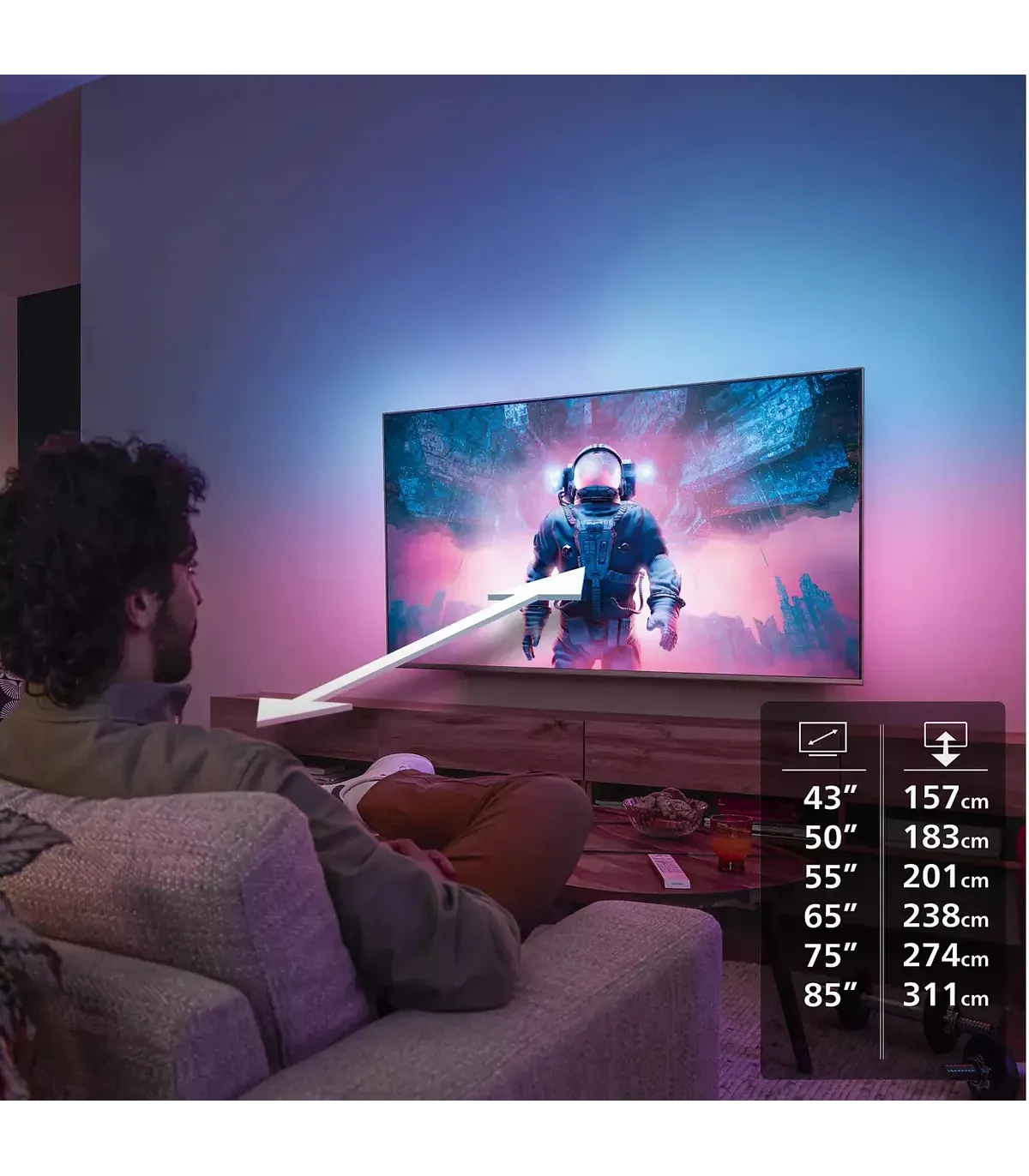 Découvrez le Philips Ambilight 85PUS8510, un géant home cinéma de 85" (215 cm) au design élégant bord à bord, sublimé par l’Ambilight pour une immersion totale. Profitez d’une image spectaculaire grâce à la dalle 4K UHD (3840 x 2160) QLED avec HDR10/HDR10+ et Dolby Vision, pilotée par un processeur P5 pour un contraste profond, des couleurs riches et une fluidité exemplaire. Le son enveloppant Dolby Atmos renforce chaque scène avec clarté et puissance. Animé par Titan OS pour une navigation fluide, commandes vocales et un vaste choix d’applications. Côté connectique: HDMI (eARC/ARC), USB, sortie optique, port Ethernet, CI+, et prise casque pour une compatibilité optimale avec consoles, barres de son et lecteurs. Restez connecté avec le Wi‑Fi double bande et le Bluetooth pour vos accessoires sans fil. Le Philips 85PUS8510 réunit performance, élégance et simplicité pour un spectacle 4K grandeur nature à domicile.