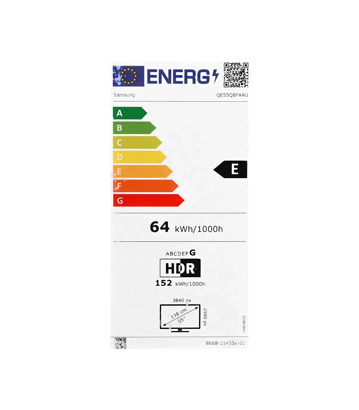 Découvrez le Samsung Q8F QE55Q8FAAU, un téléviseur QLED 4K de 55" qui sublime vos films, séries et jeux. Sa dalle QLED 4K (3840 x 2160) avec Neo Quantum HDR+, HDR10+ Adaptive et Supreme UHD Dimming offre des contrastes profonds et des couleurs éclatantes, tandis que Motion Xcelerator et un taux de rafraîchissement 60 Hz garantissent une action fluide. Le design AirSlim 3 bords sans cadre s’intègre élégamment à votre intérieur, avec VESA 200 x 200 pour un montage mural aisé. Côté son, profitez d’un audio immersif grâce à OTS+, Q‑Symphony, eARC, AVA et Son Adaptatif+ (2.0 ch, 20 W RMS). Smart TV sous Tizen, il intègre Samsung TV Plus, Art Store, Samsung Health, Multi View, Tap View et la commande vocale (Bixby, Alexa, AirPlay 2). Connectivité complète: Wi‑Fi 5, Bluetooth 5.3, Ethernet, 3x HDMI, 2x USB 3.2, optique, CI+ 1.4, Anynet+ (CEC). Efficace et responsable, avec Mode Éco, Capteur Eco, classe SDR E et 64 kW