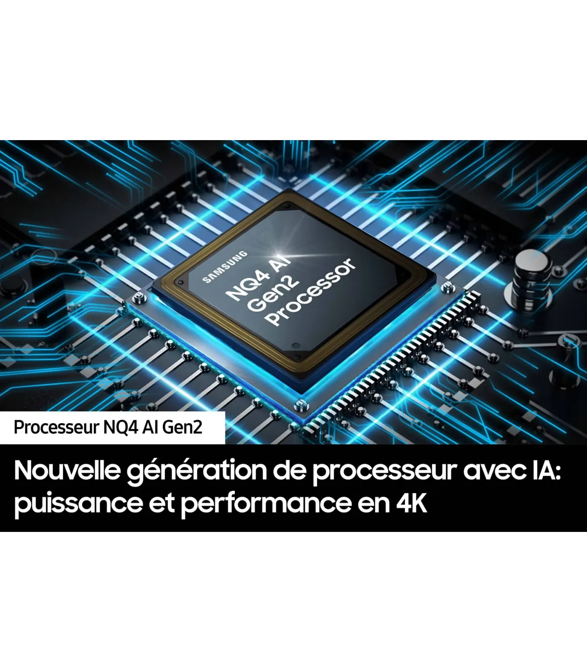 Au cœur du Samsung TQ65QN86D se trouve le processeur Neo Quantum 4K. Grâce à l’intelligence artificielle, il analyse et optimise chaque image pour offrir une qualité visuelle optimale en toutes circonstances. Il améliore la netteté, réduit le bruit et ajuste la luminosité et les contrastes de manière dynamique selon la scène affichée. Cette puissance de traitement garantit également un fonctionnement fluide des applications et un passage instantané entre les différentes sources et contenus.