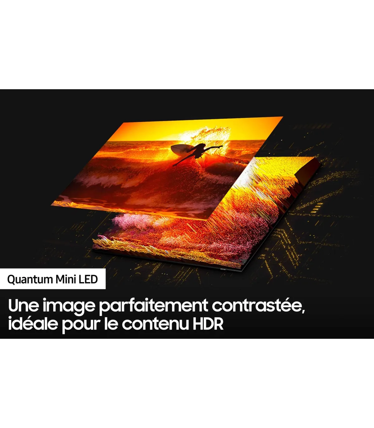 Doté d’une dalle Neo QLED de 65 pouces, le Samsung TQ65QN86D offre une résolution 4K Ultra HD qui transforme chaque scène en une expérience visuelle immersive. La technologie Quantum Matrix améliore la luminosité et le contraste, garantissant des noirs profonds et des blancs éclatants. La colorimétrie Quantum Dot restitue des couleurs vibrantes et fidèles à la réalité, tandis que le processeur Neo Quantum 4K optimise chaque image pour des détails précis, même dans les scènes les plus complexes. Les mouvements rapides des films d’action ou des événements sportifs restent fluides grâce au taux de rafraîchissement élevé et à la technologie Motion Xcelerator.