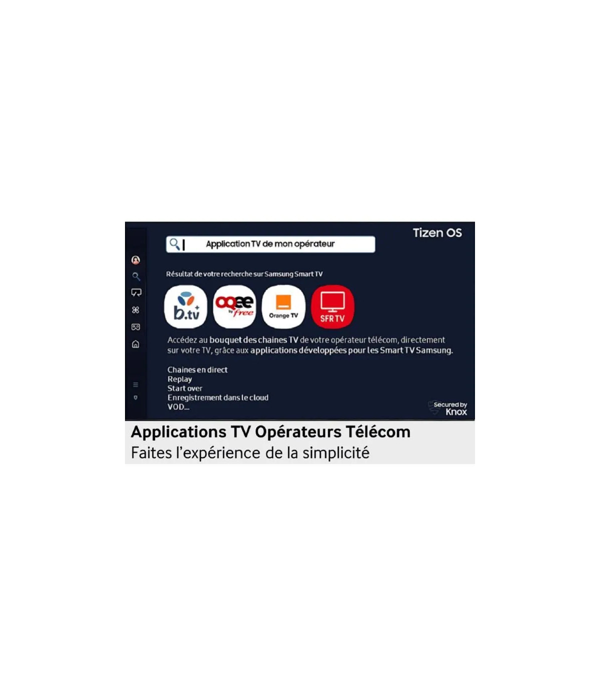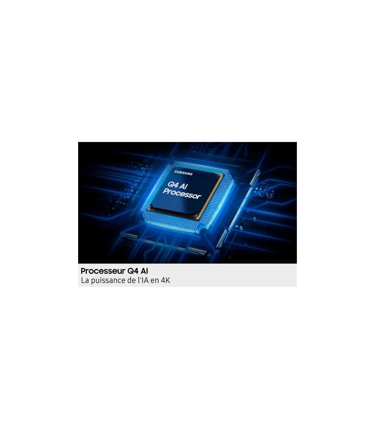Au cœur de ce bijou technologique se trouve un processeur puissant qui garantit non seulement une image parfaite mais aussi une navigation fluide grâce au système d'exploitation TV Tizen OS. Simple et intuitif, il permet l'accès rapide à vos applications favorites comme Netflix, YouTube ou encore Amazon Prime Video.