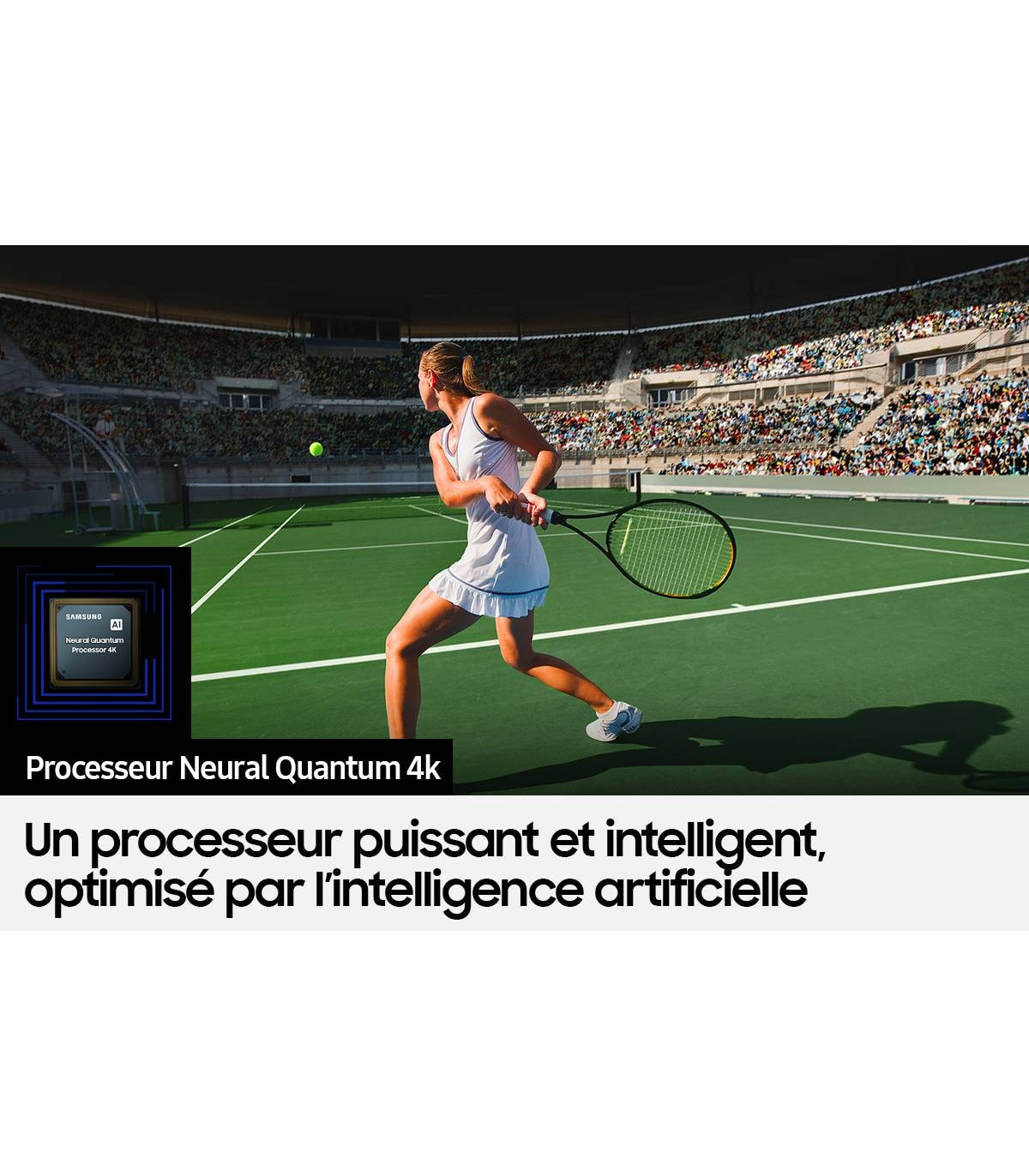 Cette TV est alimenté par un processeur Quantum 4K qui assure une qualité d'image exceptionnelle et une fluidité remarquable. Ce processeur intelligent ajuste également la luminosité et le contraste en temps réel pour des images toujours parfaites, quel que soit l'éclairage.