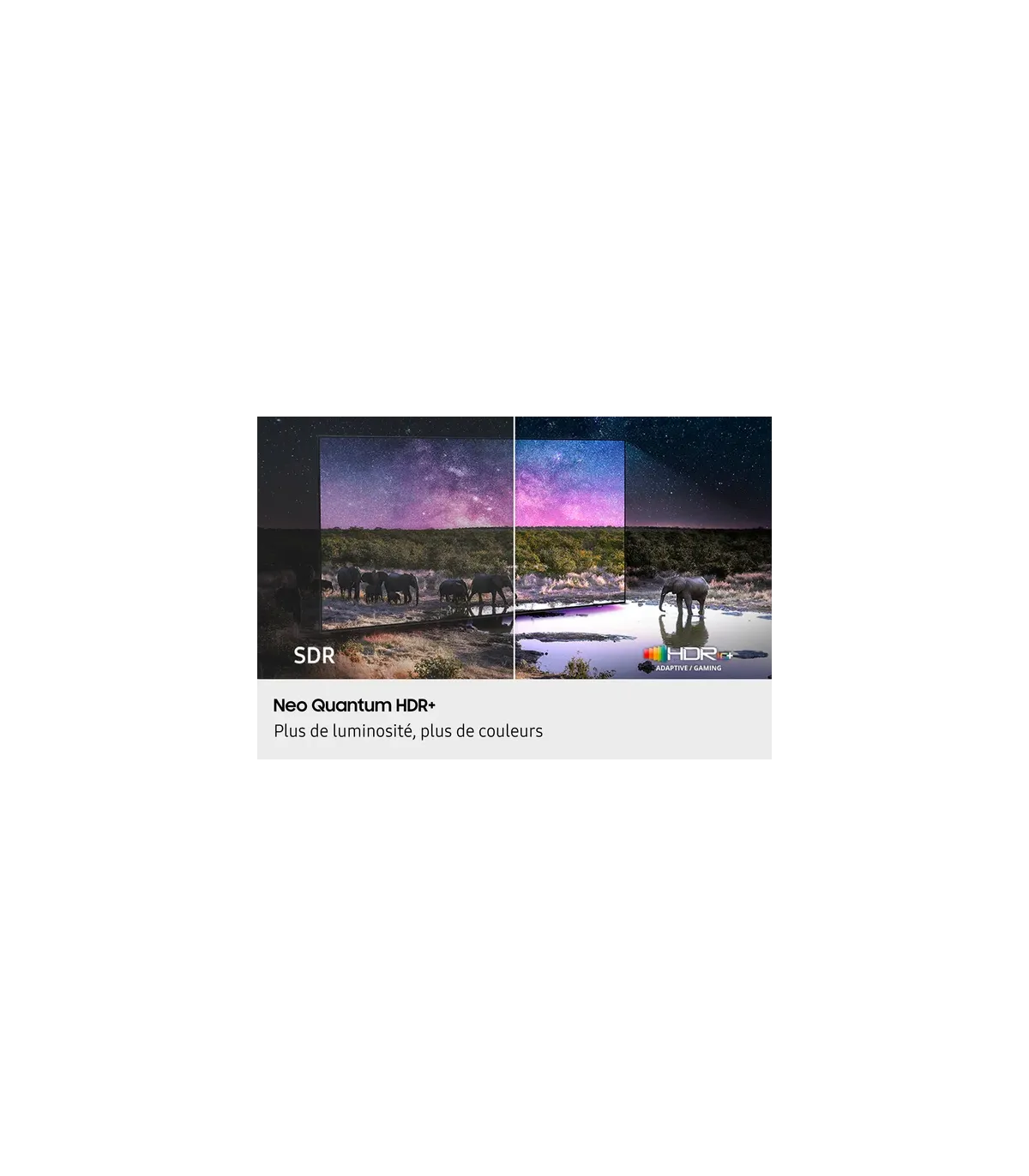 Équipé d’une dalle Neo QLED de 98 pouces, ce téléviseur offre une résolution 4K Ultra HD (3840 x 2160 pixels). Grâce à la technologie Quantum Matrix et au rétroéclairage Mini LED, chaque détail est rendu avec précision et contraste profond, offrant des noirs profonds et des blancs éclatants. La gestion dynamique du HDR10+ assure des scènes lumineuses et réalistes, idéales pour le cinéma à domicile.