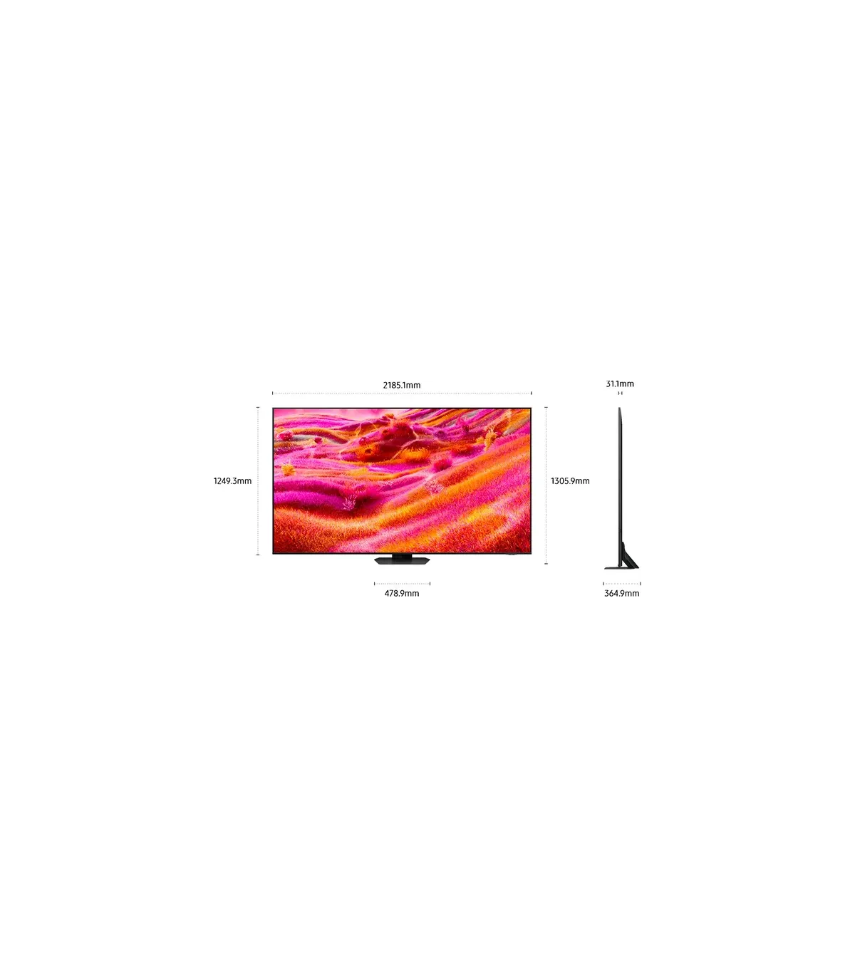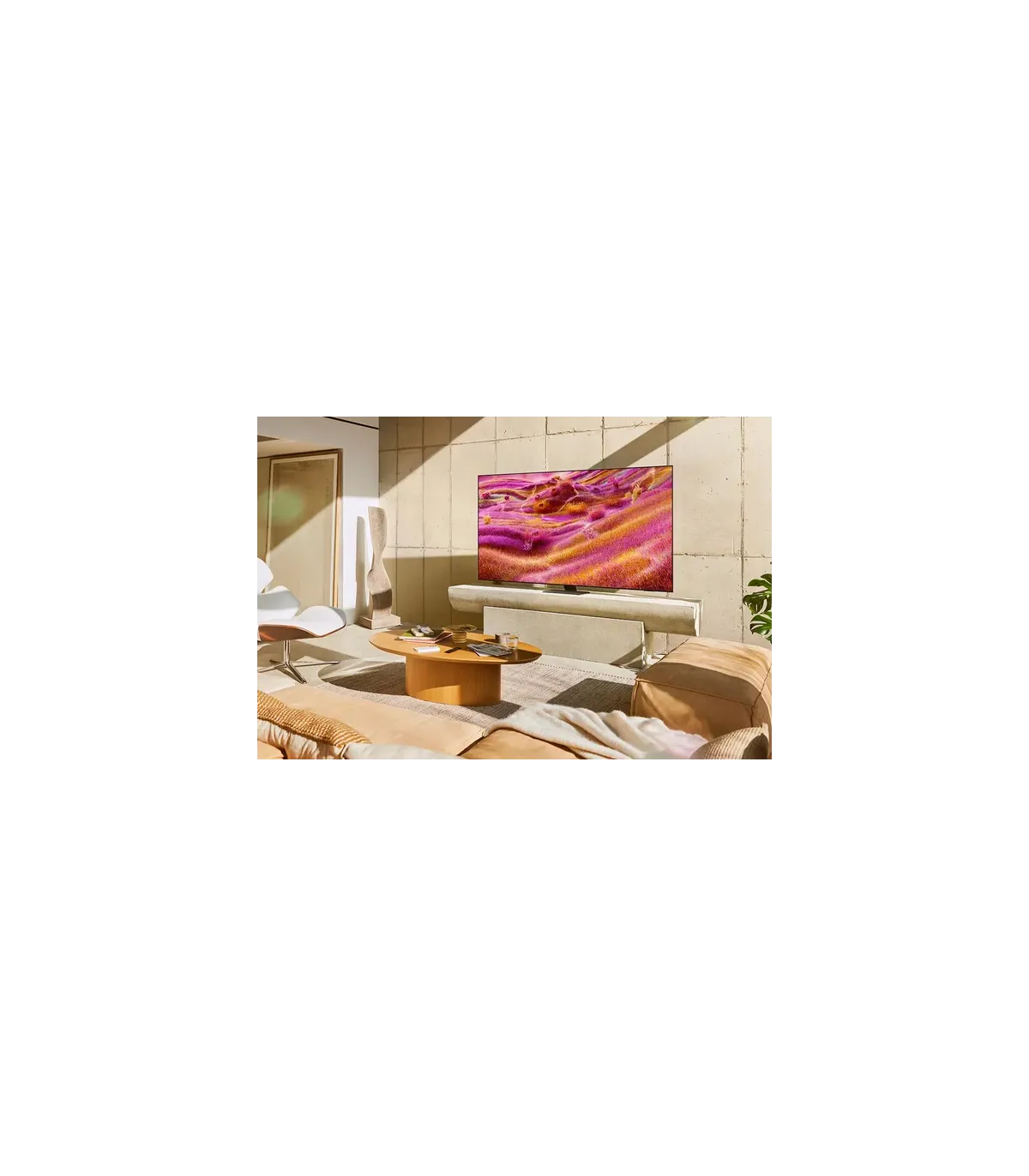 Le Samsung TQ98QN90F séduit par son esthétique ultrafine et ses lignes minimalistes. Avec son cadre métallique presque invisible et son profil extrêmement fin, il s’intègre parfaitement à tout salon moderne. Son pied central en métal assure stabilité et élégance, tout en laissant passer les câbles de manière discrète pour un rendu épuré.