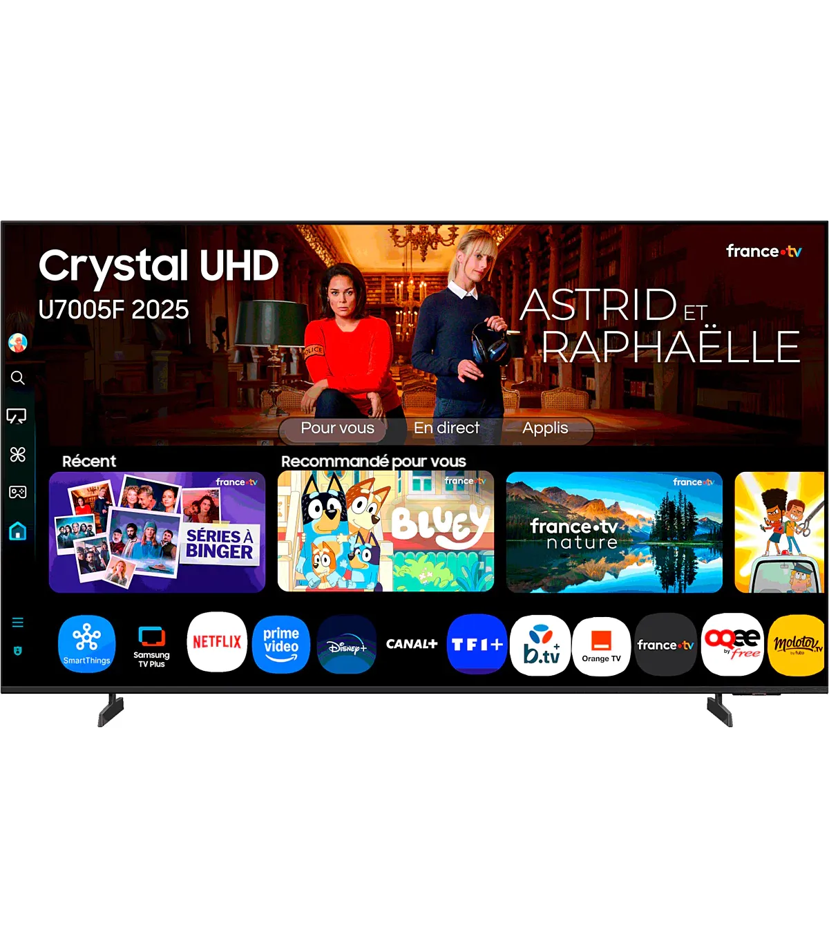 Découvrez le Samsung TU43U7005F, un téléviseur 43" (108 cm) au design fin et élégant qui sublime votre salon. Profitez d’une image 4K UHD (3840 x 2160) éclatante, boostée par le Processeur Crystal 4K pour des couleurs précises et un excellent upscaling. La technologie HDR révèle davantage de détails dans les scènes sombres et lumineuses, tandis que le mode Game Enhancer réduit la latence pour une action plus fluide. Le son clair et équilibré des haut-parleurs 2.0 assure une immersion home cinéma convaincante. Côté Smart TV, profitez d’une interface rapide et intuitive avec Tizen pour accéder à vos applications de streaming préférées. La connectique complète inclut 3x HDMI, 2x USB, 1x Ethernet (LAN), 1x sortie optique (Audio Digital Out), et CI+. Restez connecté avec le Wi‑Fi intégré et le Bluetooth pour barre de son, casque ou manette. Montable au mur VESA, ce TV optimise espace et style, prêt à devenir le cœur de votre expérience home cinéma.