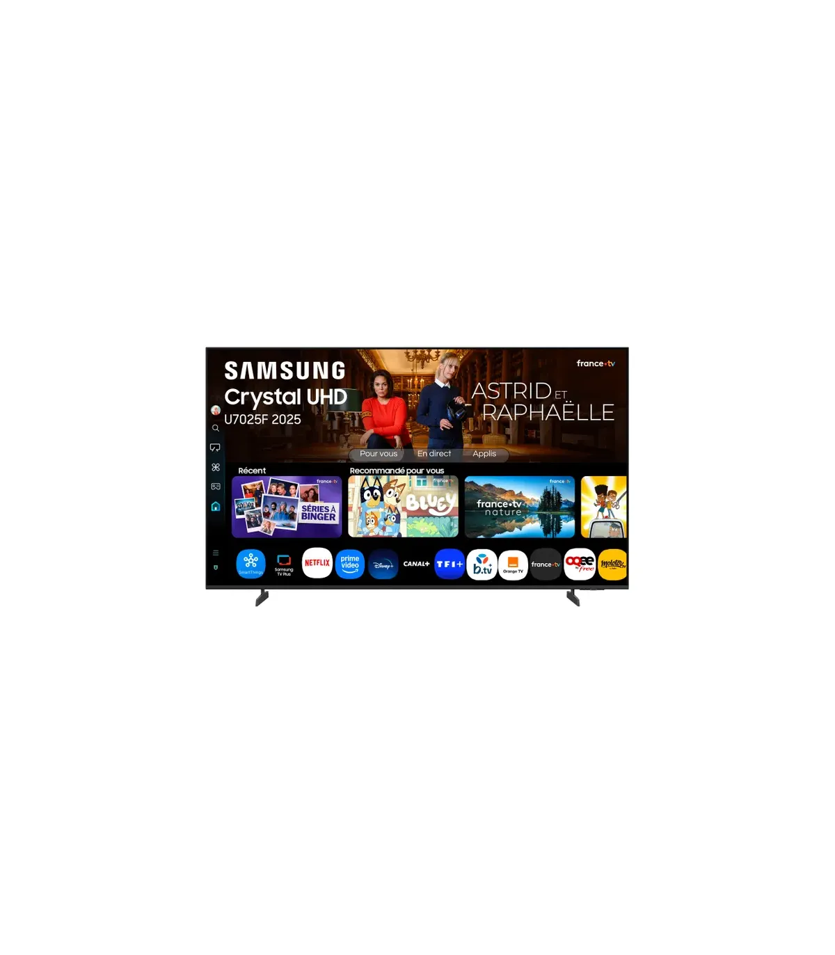 Découvrez le Samsung TU55U7025F, un téléviseur 55" conçu pour sublimer votre salon home cinéma. Son design élégant aux bords fins met en valeur une dalle 55" (139 cm), idéale pour une immersion totale. Profitez d’images nettes et lumineuses en 4K Ultra HD (3840 x 2160) grâce au Crystal UHD et au processeur Crystal 4K, qui optimise contraste, couleurs et upscaling. Les scènes d’action restent fluides et détaillées, tandis que le son clair met en valeur dialogues et bandes‑son.