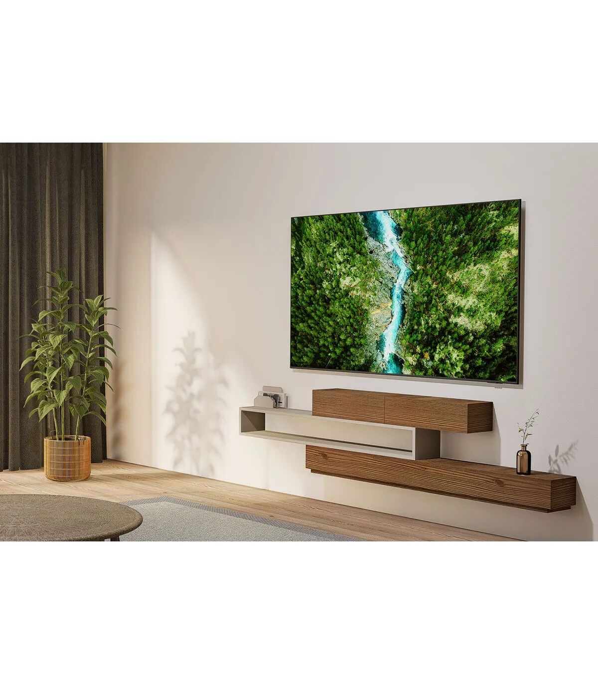 Conçu pour s’intégrer harmonieusement à tout intérieur, ce téléviseur 55 pouces affiche un profil élancé et des bords affinés pour mettre l’image au premier plan. Sa silhouette minimaliste s’accompagne d’un pied discret et stable, tandis que la gestion des câbles intégrée maintient un espace audiovisuel propre et ordonné. La diagonale de 55" (139 cm) offre un impact visuel généreux sans encombrer, idéale pour un salon moderne orienté home cinéma.