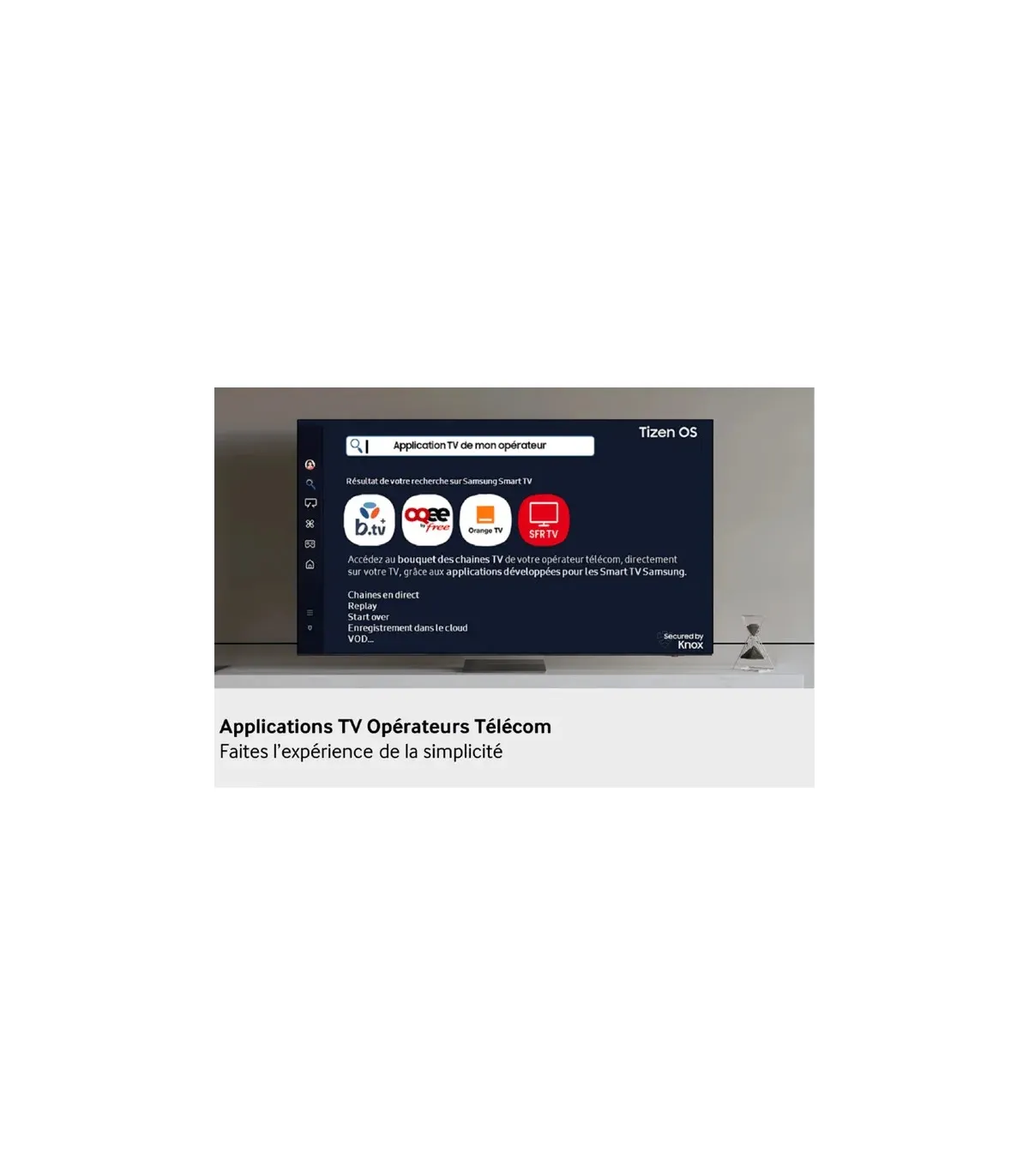 Basé sur Tizen, l’interface est fluide et réactive, donnant accès aux principales plateformes de streaming, à la commande vocale et à une sélection d’applications locales. La navigation est intuitive, la recherche de contenus centralisée et les mises à jour régulières renforcent la sécurité et la stabilité.