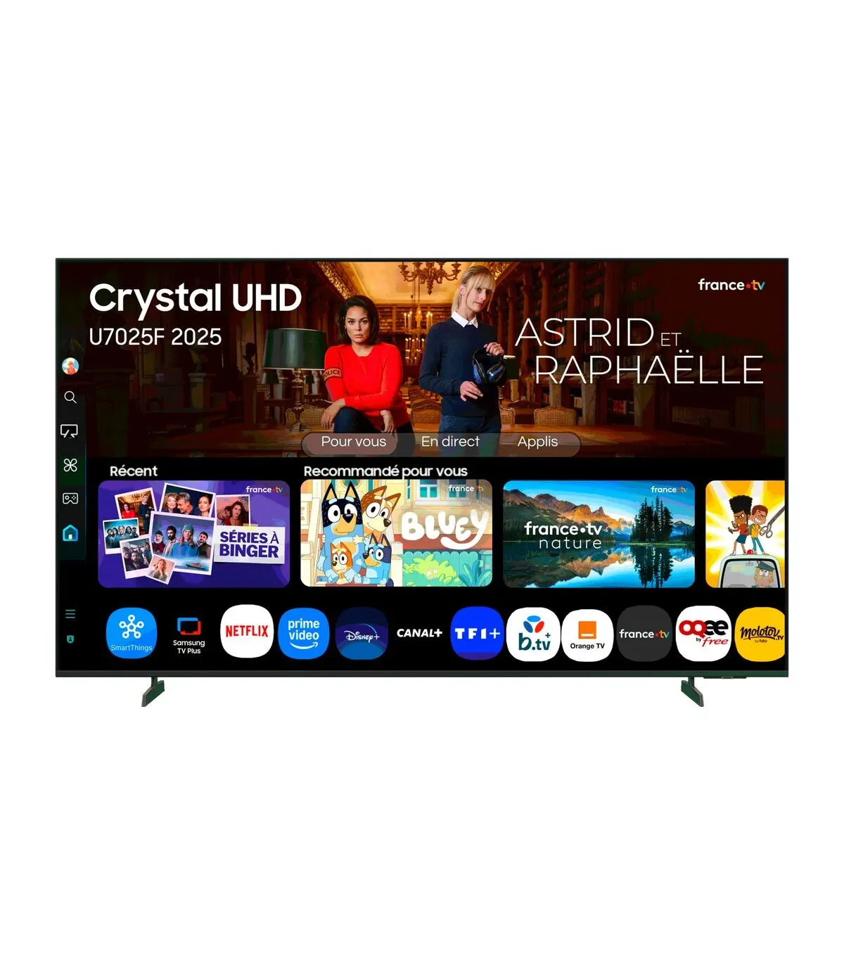 Découvrez le Samsung TU65U7025F 65" (163 cm), un téléviseur 4K Crystal UHD LED pensé pour le home cinéma. Son design fin et élégant sublime votre salon, tandis que la résolution 3840 x 2160 délivre une image précise, aux couleurs éclatantes grâce au Crystal Display et au processeur Crystal 4K. Profitez d’un son immersif avec Adaptive Sound et d’une expérience fluide via le système d’exploitation Tizen pour accéder facilement à vos applications préférées. Côté connectique, bénéficiez de HDMI, USB, sortie audio optique, Ethernet (LAN) et CI+ pour tous vos équipements. La connexion sans fil est complète avec Wi‑Fi et Bluetooth intégrés pour une installation épurée et une compatibilité élargie avec barres de son et accessoires. Idéal pour films, séries et sport, le Samsung TU65U7025F combine dalle 65 pouces, 4K UHD, processeur puissant, Smart TV Tizen, Wi‑Fi, Bluetooth et ports multiples pour une expérience spectaculaire.