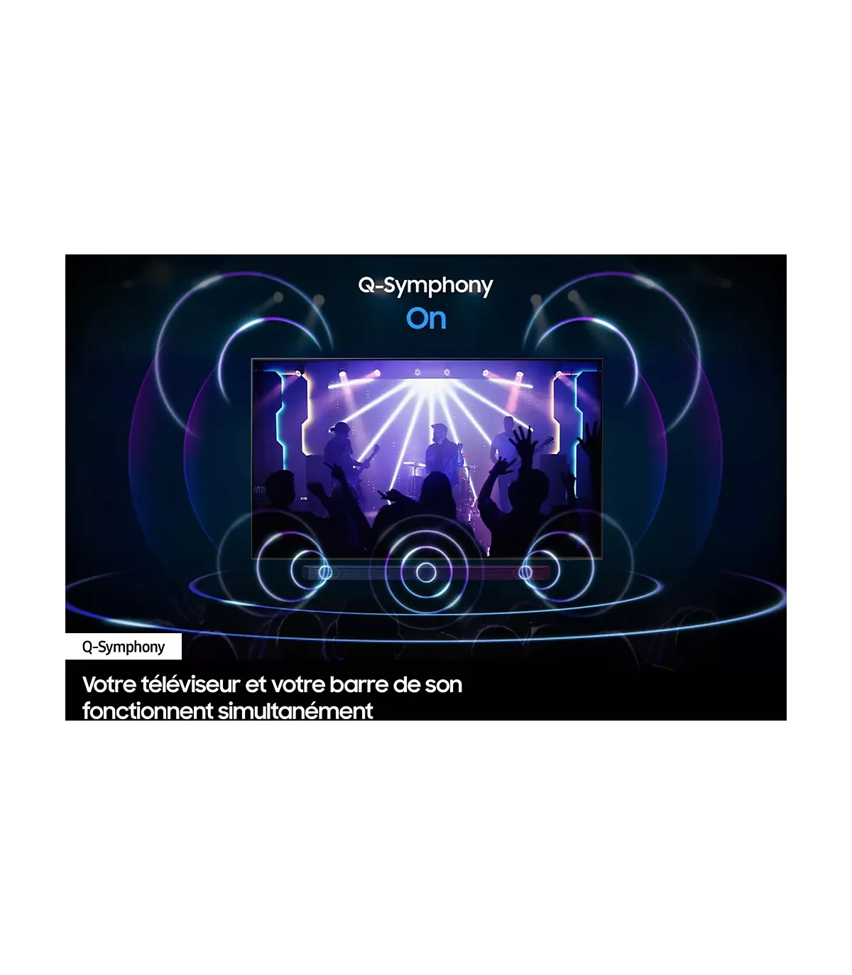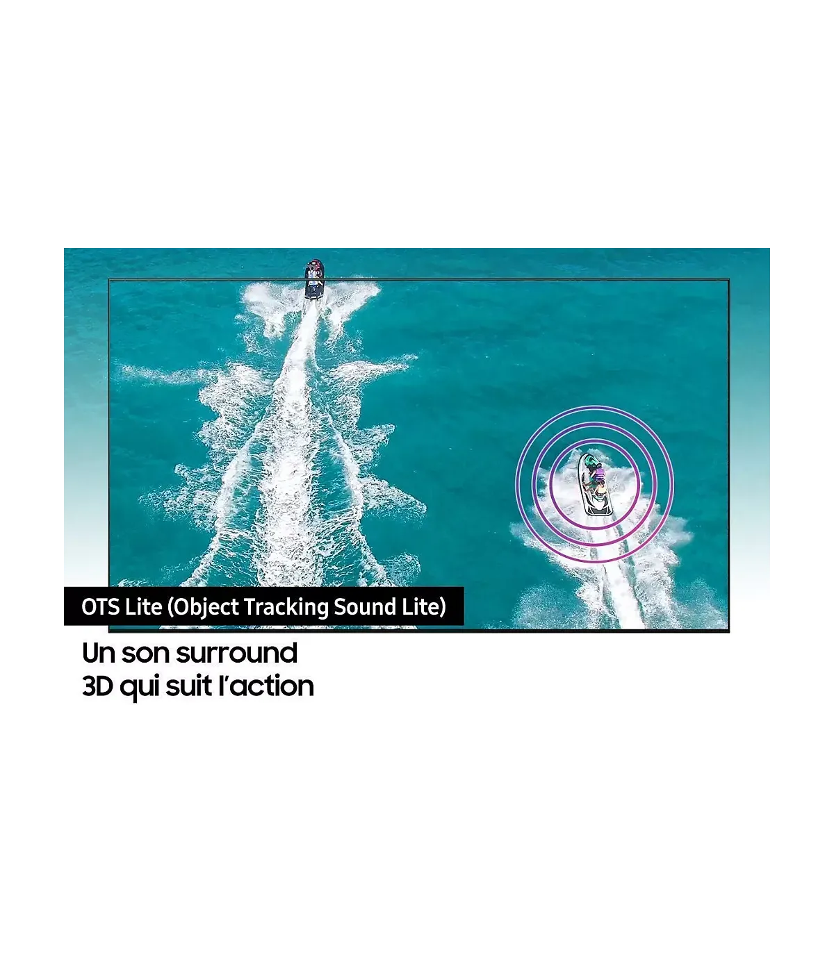 Le système audio intégré délivre 20 W en configuration 2.0 canaux avec Adaptive Sound et Object Tracking Sound Lite. Il est compatible avec Q‑Symphony pour une utilisation combinée avec barre de son. Pour profiter pleinement de l’immersion sur un écran XXL, l’ajout d’un système audio externe est conseillé.