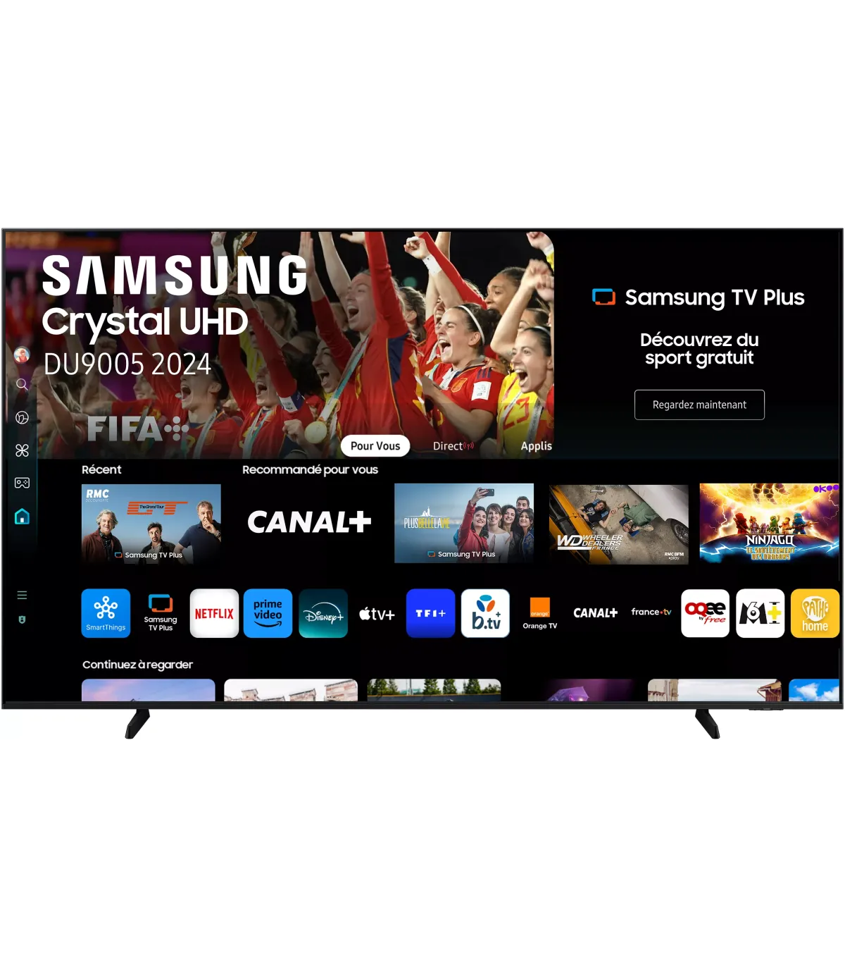 Découvrez le Samsung TU98DU9005, l’écran XXL qui transforme votre salon en salle de cinéma. Son design épuré aux bords fins sublime votre intérieur, tandis que l’image ultra‑détaillée 4K UHD (3 840 x 2 160) révèle chaque nuance. Le puissant processeur Crystal 4K optimise couleurs, contraste et mise à l’échelle pour une clarté saisissante. Profitez d’un son immersif avec technologies audio optimisées pour les dialogues et les scènes d’action. La plateforme Smart TV Tizen offre un accès fluide à vos applications et contenus préférés. Côté connectivité, bénéficiez du Wi‑Fi intégré, du Bluetooth, et d’une connectique complète avec HDMI, USB, sortie audio et port réseau pour tous vos équipements. La dalle géante de 98" (248 cm) vous plonge au cœur de l’action avec une précision lumineuse idéale pour films, séries et sport. Optez pour une expérience home cinéma aboutie, alliant performance, simplicité et élégance.