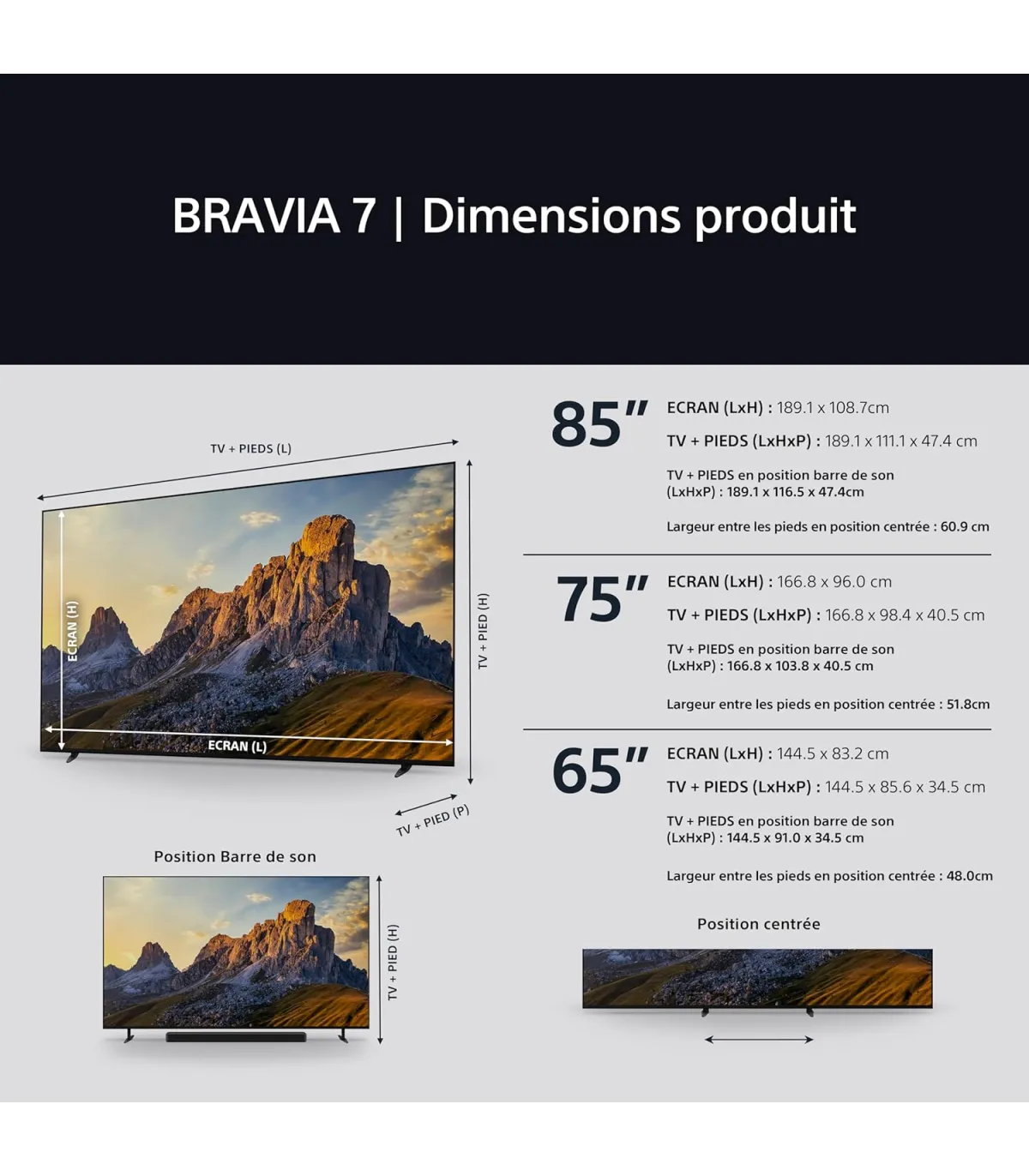 • Dimensions : 85" (diagonale 215,9 cm) ; dimensions exactes non précisées