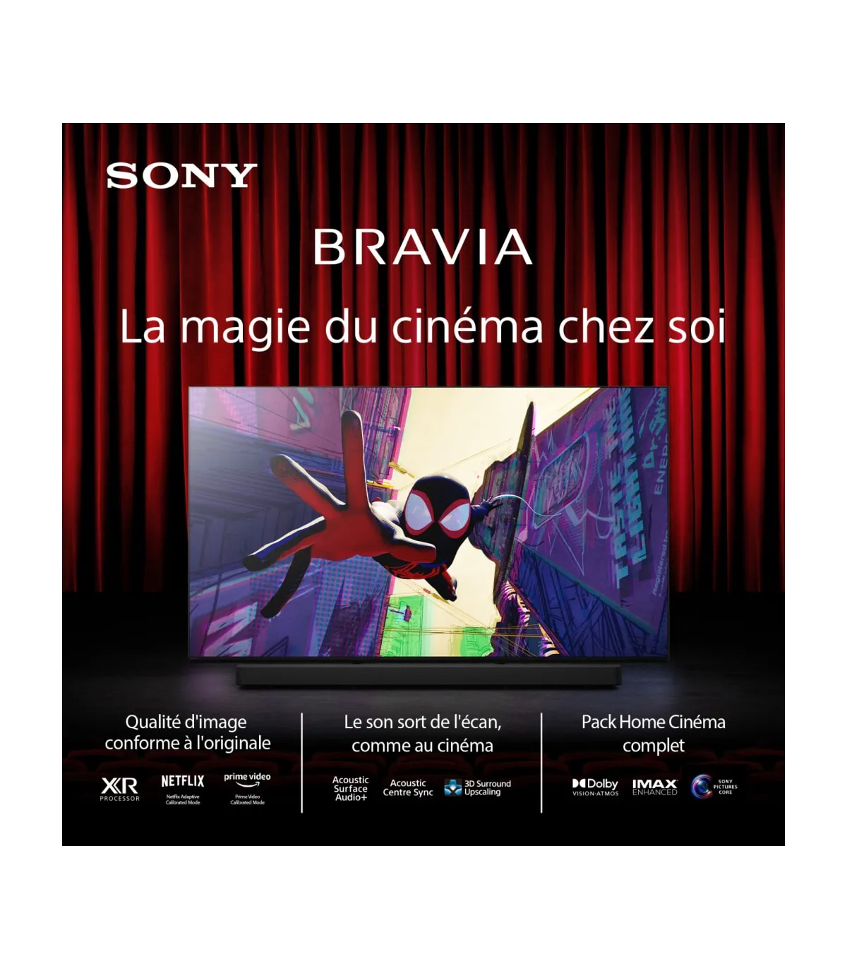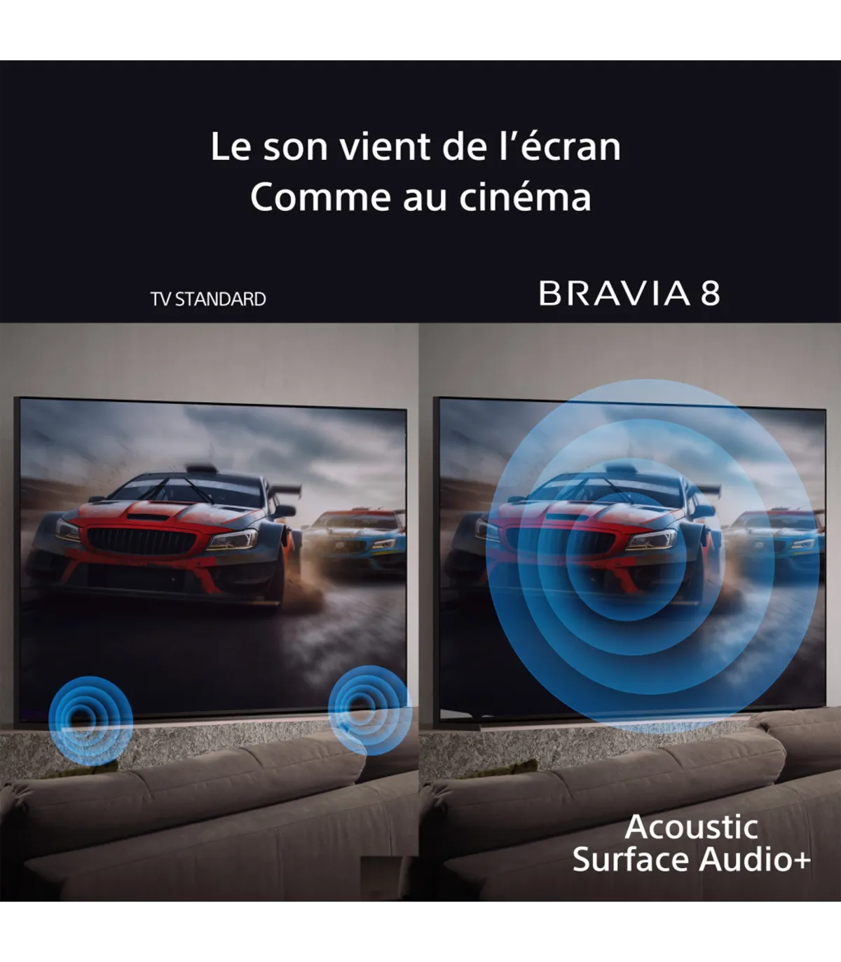 Le système audio « Acoustic Surface Audio+ » transforme l’écran en haut-parleur. L’effet : le son semble émaner directement des objets à l’écran, renforçant l’immersion. La puissance nominale est d’environ 50 W, distribuée via actionneurs et subwoofers intégrés. La compatibilité Dolby Atmos et DTS :X assure une spatialisation crédible pour le cinéma à domicile. La fonction Voice Zoom 3 met en avant les dialogues sans montée excessive du volume global, tandis que l’Acoustic Center Sync permet d’intégrer l’appareil comme canal central d’un système home-cinéma Sony compatible. Résultat : une expérience audiovisuelle complète, prête à rivaliser avec une salle dédiée.