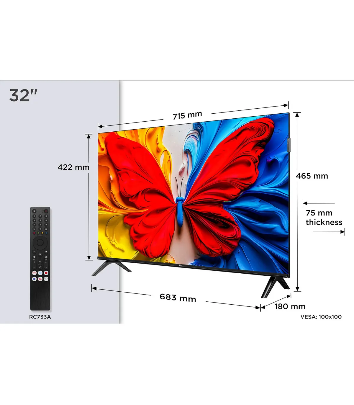 Caractéristiques clés : 32", QLED, Full HD 1080p, 60 Hz, HDR10/HLG, Google TV, Chromecast/AirPlay, HDMI eARC + ALLM, VESA 100×100.