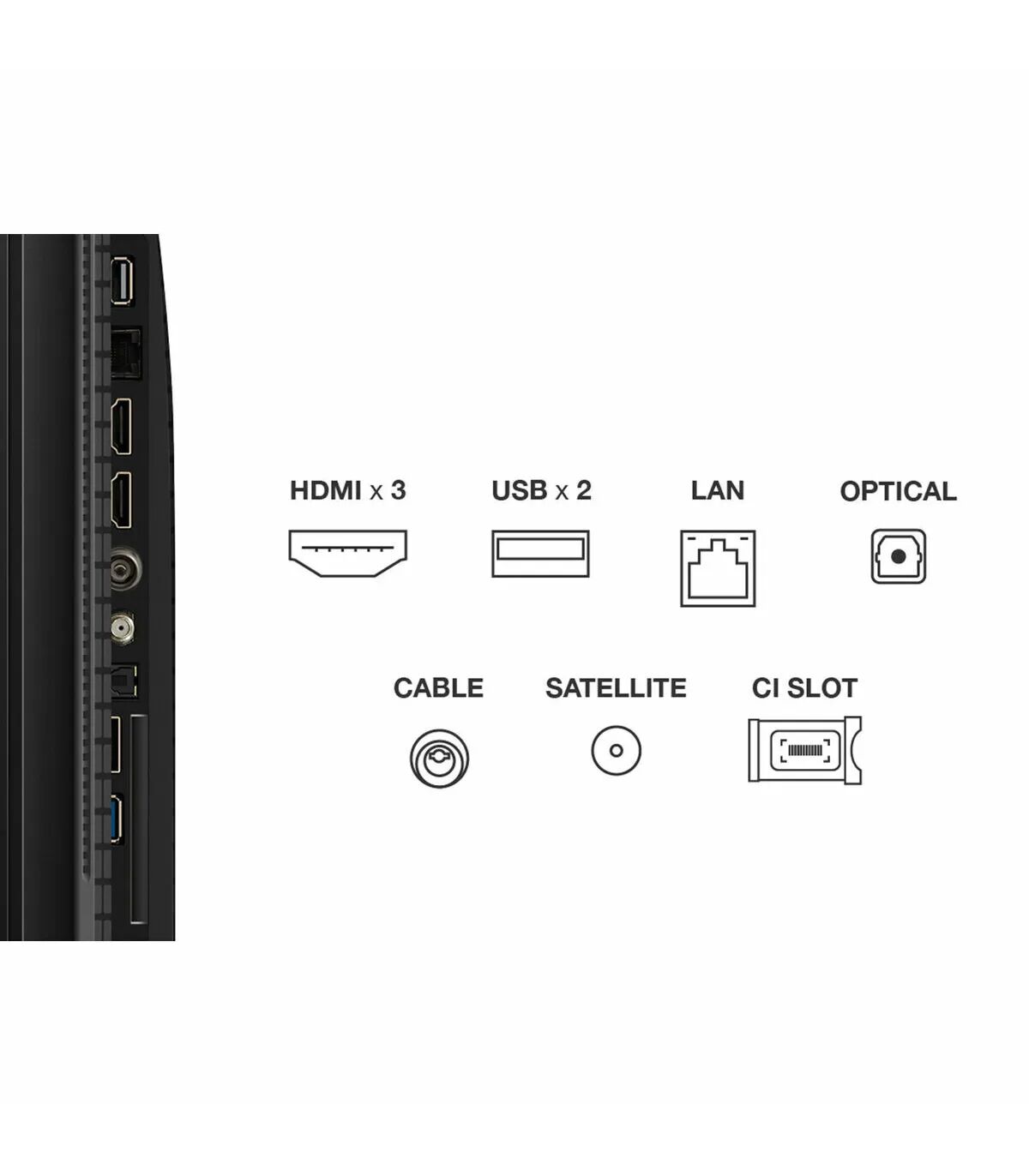 Le modèle offre 3 ports HDMI 2.1 (dont un compatible eARC/ARC pour transmission audio vers une barre ou un ampli), 1 port USB 3.0, sortie audio optique, port Ethernet (RJ45), entrée satellite / antenne (RF, DVB-T2/S2/C), un port CI+ et une entrée AV 3,5 mm. Cette connectique complète permet de raccorder simultanément console, lecteur Blu-ray, box TV et système audio externe. L’HDMI eARC garantit une liaison haute fidélité avec votre ampli ou barre sonore, essentielle pour maximiser votre immersion audio dans un contexte home cinéma 4K.