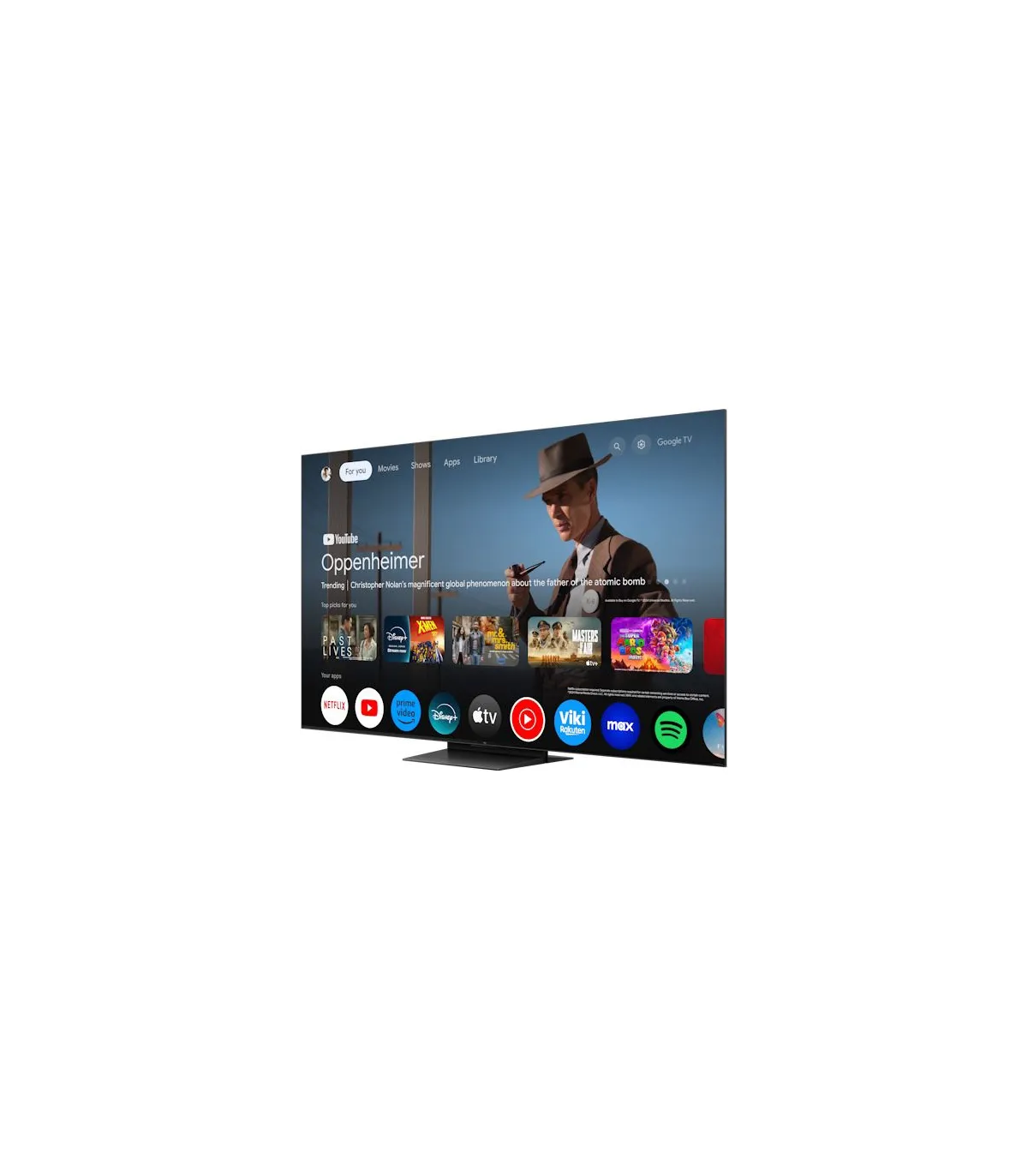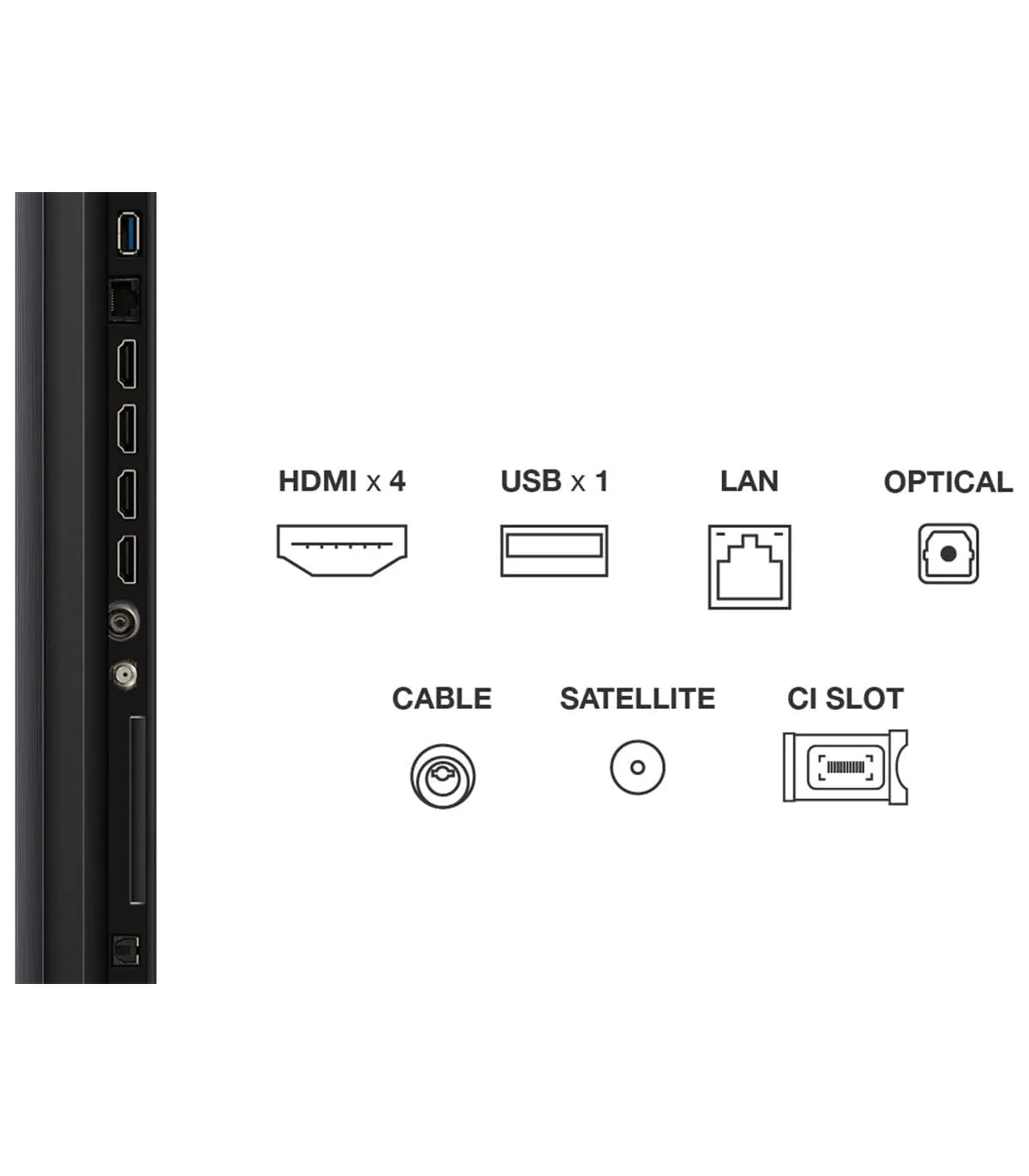 Le téléviseur fonctionne sous Google TV, offrant une interface fluide, intuitive et personnalisable. L’accès aux services de streaming (Netflix, Prime Video, YouTube, etc.) est immédiat, et le contrôle vocal via Google Assistant permet de lancer des applications, de chercher du contenu ou d’ajuster le volume simplement à la voix. Côté connectique, il est très bien pourvu : 4 ports HDMI (dont au moins un HDMI 2.1 avec eARC), un port USB, Ethernet RJ‑45, Bluetooth (v5.4), Wi-Fi 5, une sortie audio optique et un slot CI+.